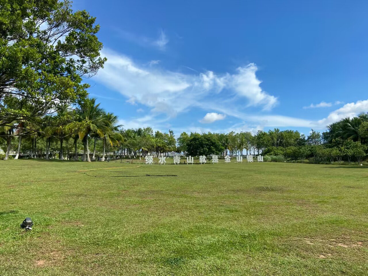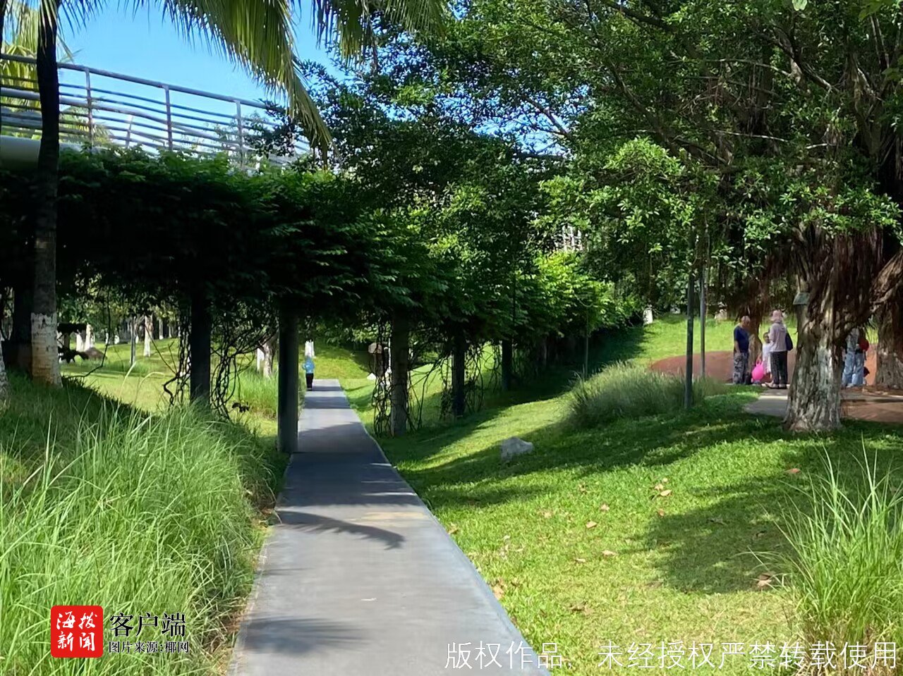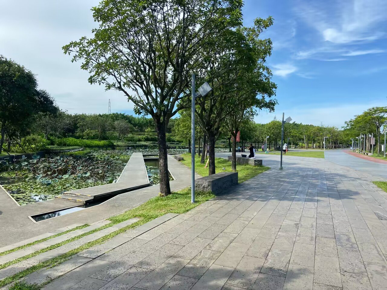 走在凤翔公园,地上的大叶油草翠绿欲滴。相比于普通的草皮,大叶油草叶片大而茂盛,耐旱、耐踩、养护成本低。公园内的树木以椰子树为主,还有散落的荔枝树、莲雾树。