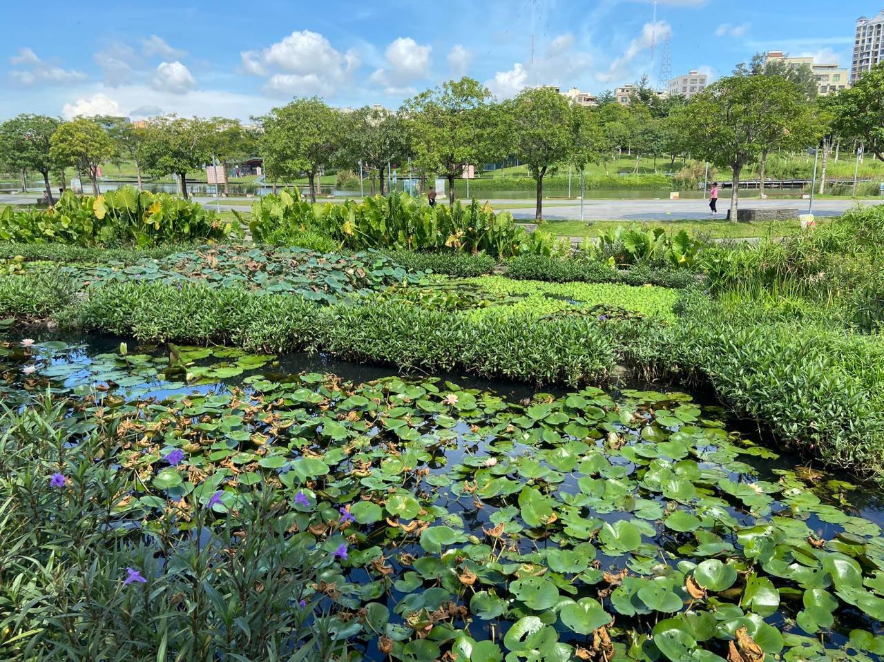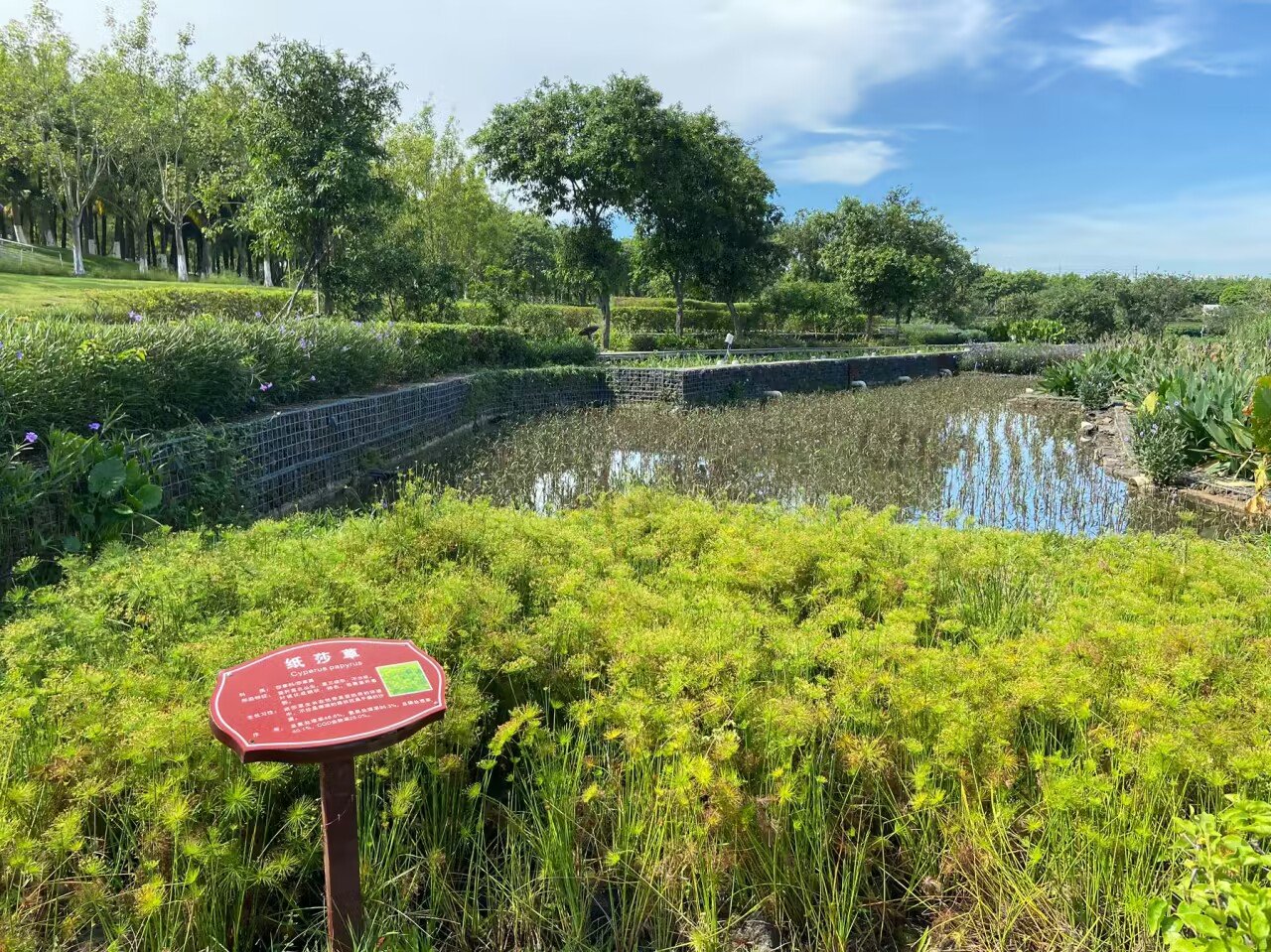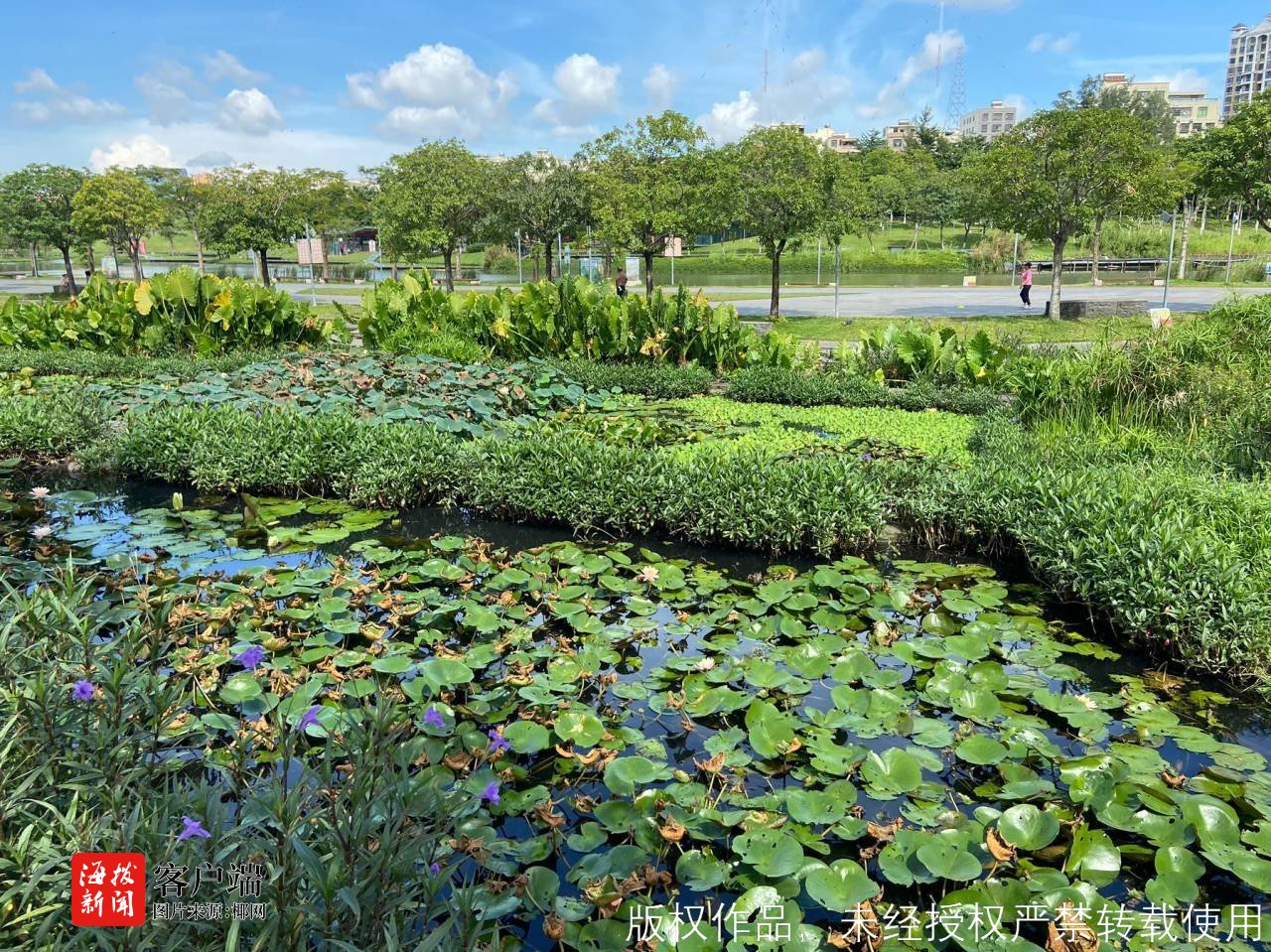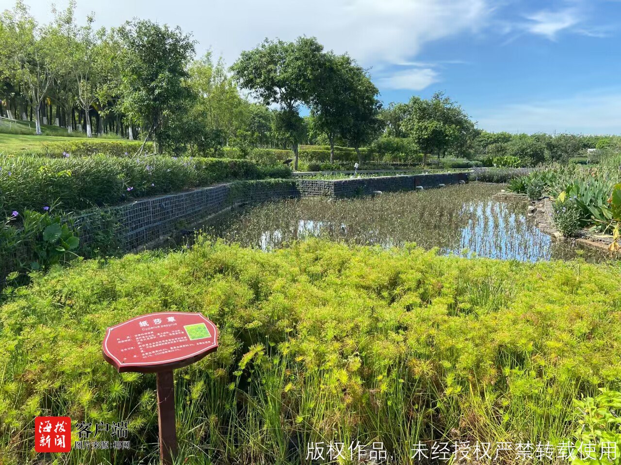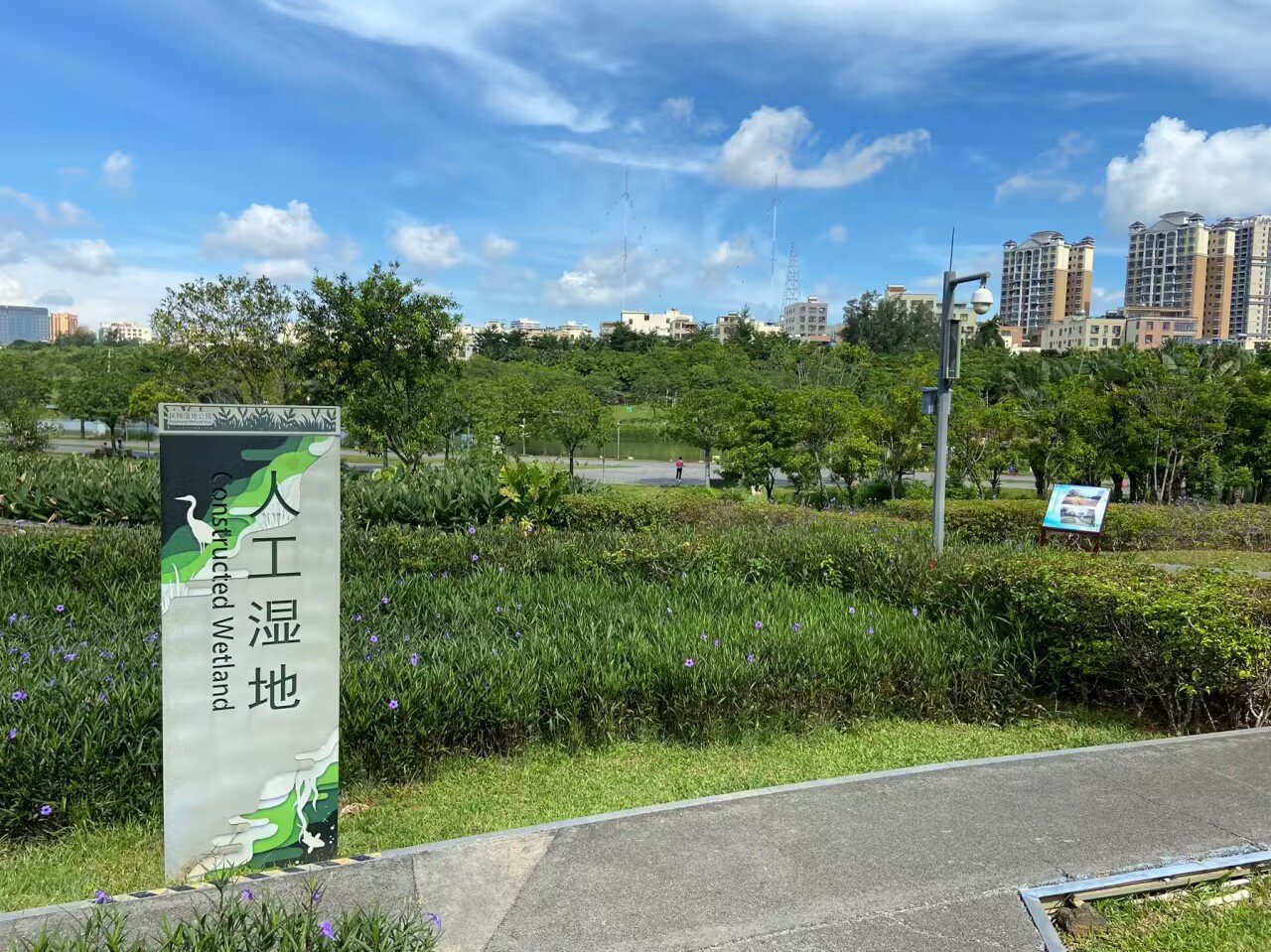 在美舍河国家湿地公园内,沿着河岸慢行栈道穿行,只见水菜花、美人蕉等水生植物点缀岸边自然天成;郁郁葱葱的黄槿、椰子树等植物风中摇曳……一幅湿地的优美景观展现在人们面前。由树池洼地、枯木等串起的景观,给生物提供了栖息地,也成为公园人与自然和谐相处的独特风景,蝴蝶、蜻蜓飞舞,不时传来虫鸣鸟叫声。