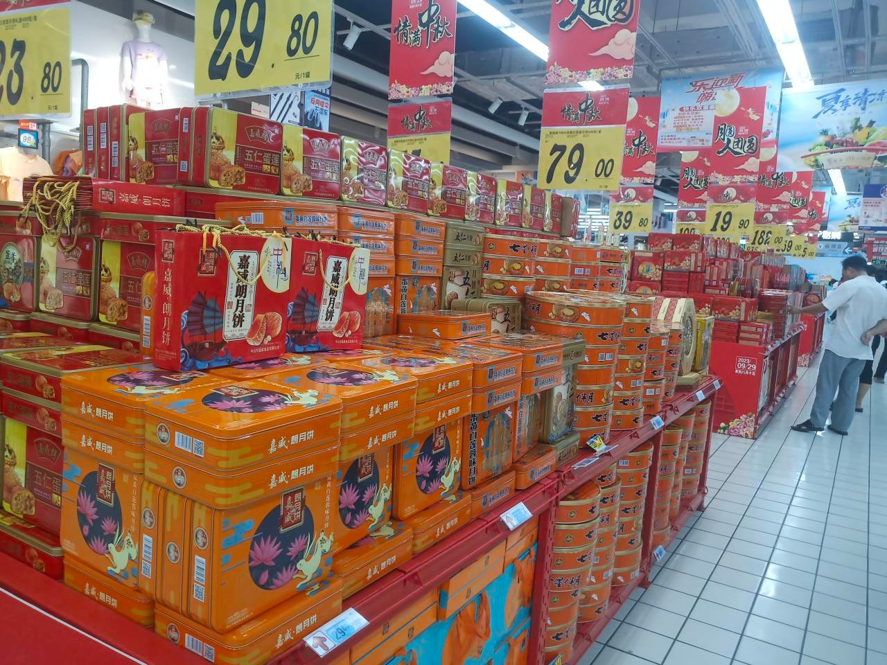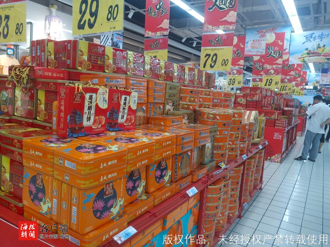 商报全媒体讯(椰网/海拔新闻记者 徐明锋 摄影报道)8月29日,距离我国传统节日中秋节正好一个月,海口的大街小巷已经飘出月饼的香味。记者走访海口市多家商超、蛋糕店,发现各式各样的月饼已经上市销售,销售价格因品牌、规格等而异,多在400元以下,不少市民已经开始选购尝鲜。
