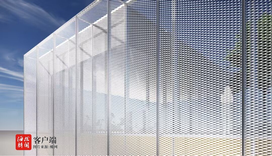 建筑立面采用带有“丝绸”质感的金属拉伸网材质,这层细腻的网状围护结构与建筑外墙间留有一定距离,形成丰富的光影效果,使漂浮在像素化场地的建筑体量更加轻盈灵动。金属网能够起到遮阳作用,双层幕墙结构也具有一定绿色节能效果。