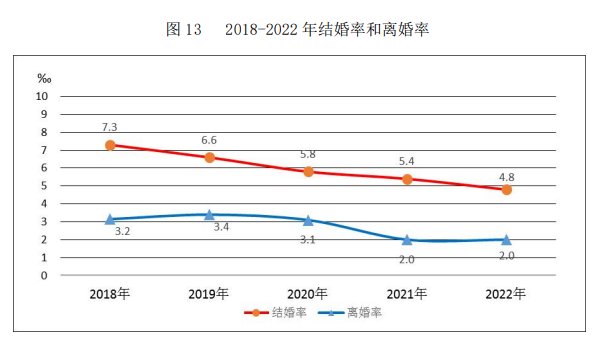 2022年,我国结婚登记人口中,20-24岁人群占比15.2%,比上一年下降1.3个百分点。