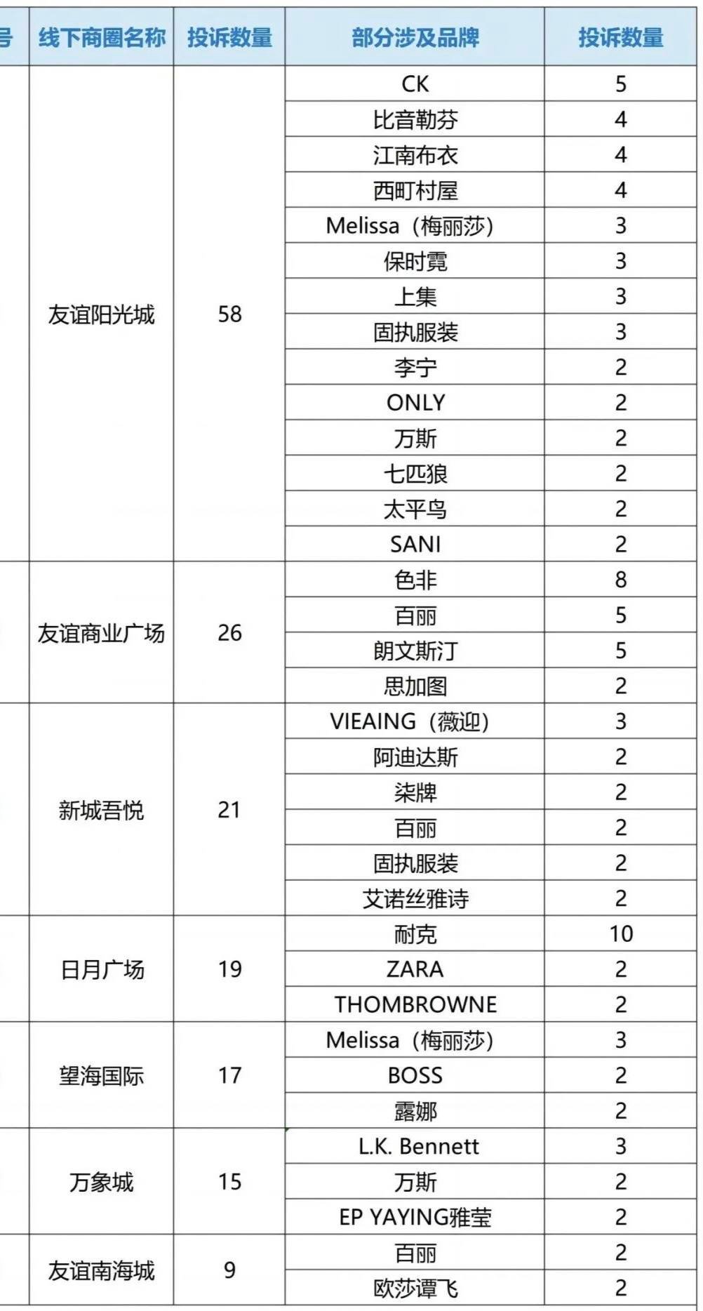 线下被投诉较多的商圈是友谊阳光城、友谊商业广场、新城吾悦、日月广场、望海国际、万象城、友谊南海城等7家,被投诉较多的品牌是CK、比音勒芬、江南布衣、西町村屋、Melissa(梅丽莎)、保时霓、上集、固执服装、李宁、ONLY、万斯、七匹狼、太平鸟、SANI、色非、百丽、朗文斯汀、思加图、VIEAING(薇迎)、阿迪达斯、柒牌、艾诺丝雅诗、耐克、ZARA、THOMBROWNE、BOSS、露娜、L.K. Bennett、EP YAYING雅莹、欧莎谭飞等30家。