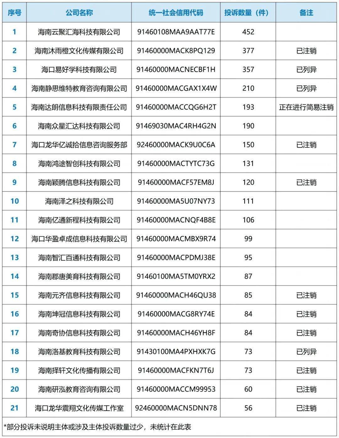被投诉较多的教育培训服务机构是海南云聚汇海科技有限公司、海南沐雨橙文化传媒有限公司、海口易好学科技有限公司、海南静思维特教育咨询有限公司、海南达朗信息科技有限责任公司、海南众星汇达科技有限公司、海口龙华亿诚拾信息咨询服务部、海南鸿途智创科技有限公司、海南颖腾信息科技有限公司、海南泽之科技有限公司、海南亿通新程科技有限公司、海口华盈卓成信息科技有限公司、海南智汇百通科技有限公司、海南郡唐美育科技有限公司、海南元齐信息科技有限公司、海南坤冠信息科技有限公司、海南奇协信息科技有限公司、海南洛基教育科技有限公司、海南择轩文化传播有限公司、海南研泓教育咨询有限公司、海口龙华震翔文化传媒工作室等21家。