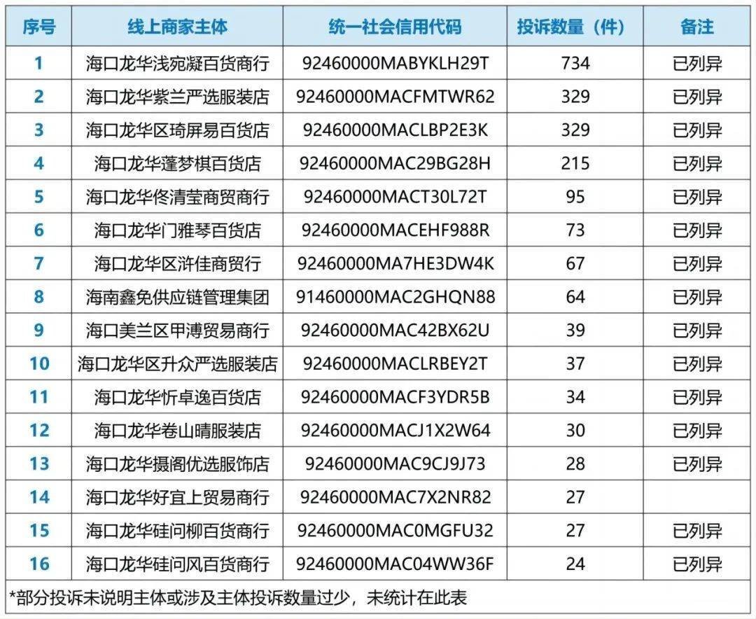 线上被投诉较多的商家是海口龙华浅宛凝百货商行、海口龙华紫兰严选服装店、海口龙华区琦屏易百货店、海口龙华蓬梦棋百货店、海口龙华佟清莹商贸商行、海口龙华门雅琴百货店、海口龙华区浒佳商贸行、海南鑫免供应链管理集团、海口美兰区甲溥贸易商行、海口龙华区升众严选服装店、海口龙华忻卓逸百货店、海口龙华卷山晴服装店、海口龙华摄阁优选服饰店、海口龙华好宜上贸易商行、海口龙华硅问柳百货商行、海口龙华硅问风百货商行等16家。