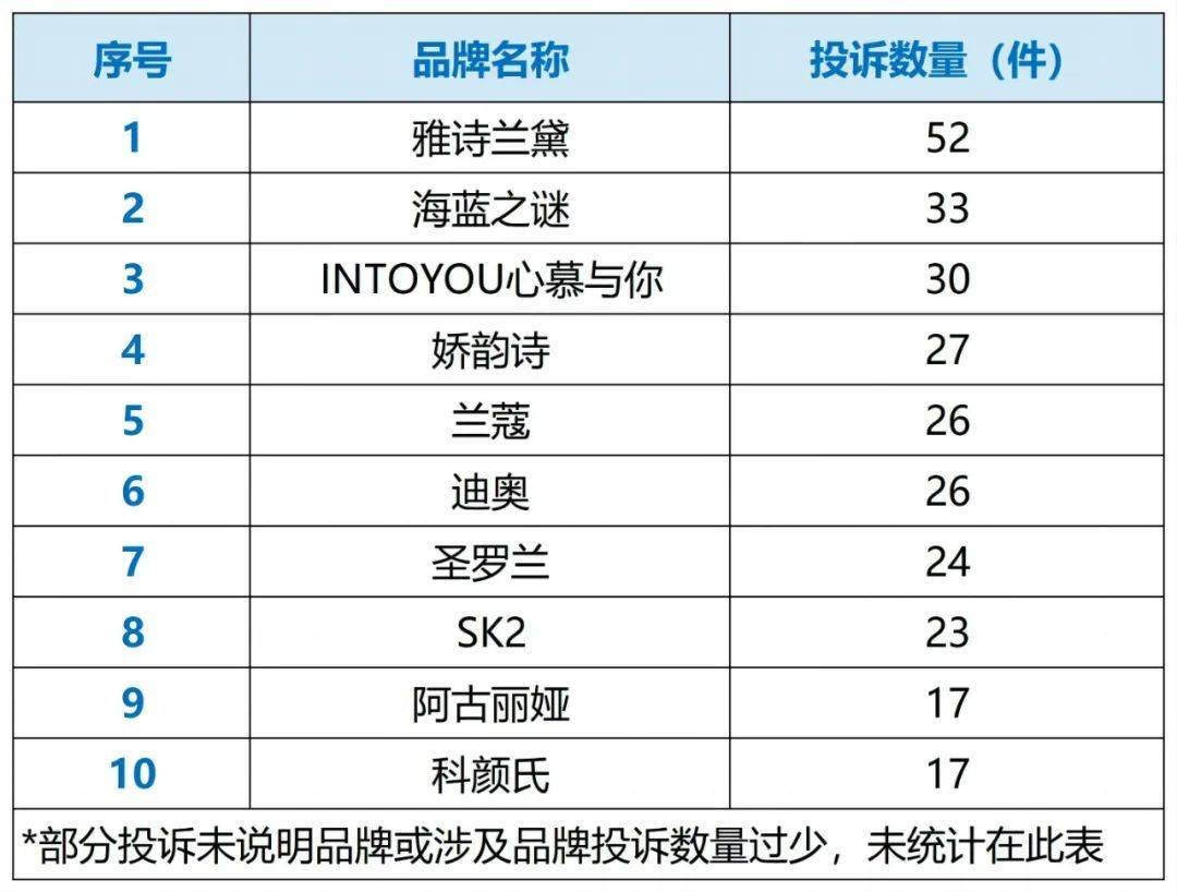 被投诉较多的化妆品品牌是雅诗兰黛、海蓝之谜、INTOYOU心慕与你、娇韵诗、兰蔻、迪奥、圣罗兰、SK2、阿古丽娅、科颜氏等10家。
