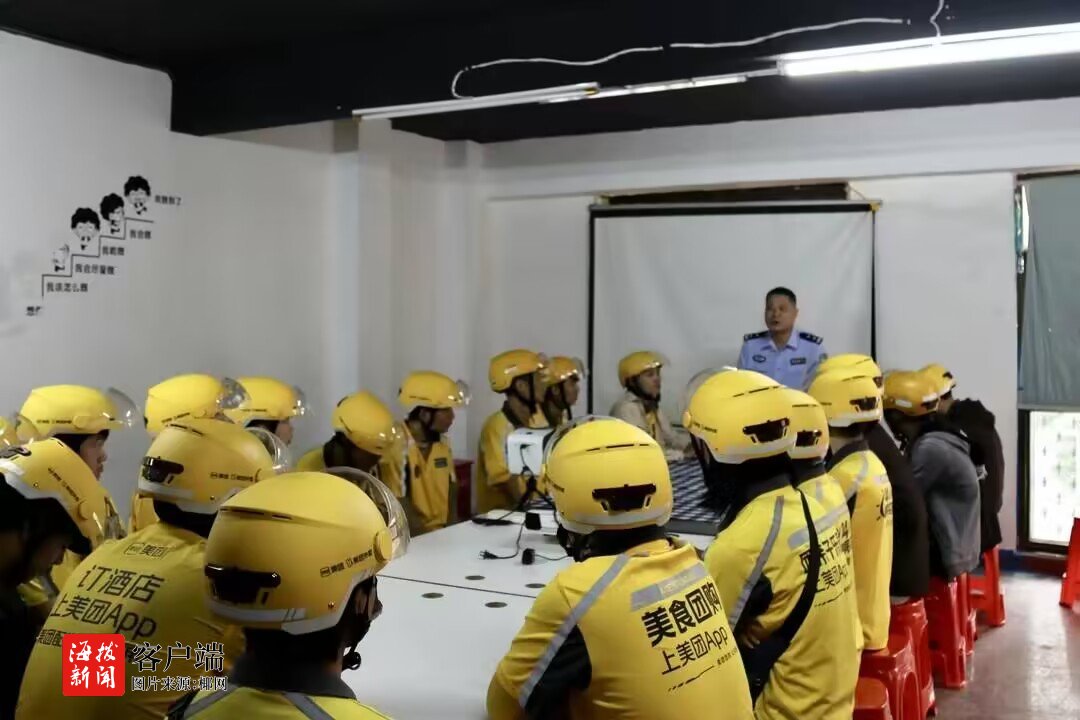 商报全媒体讯(椰网/海拔新闻记者 陈勇合 摄影报道)11月13日上午,海口公安交警走进龙华区美团配送骑手驿站,开展“戴头盔 平安行”交通安全宣传活动,为骑手们送上平安出行“锦囊”。