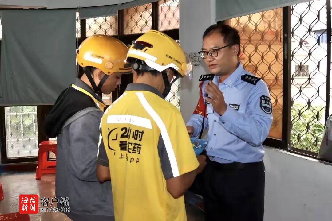 活动中,海口公安交警法制宣传科民警吴海飞向骑手发放交通安全宣传资料,并结合辖区道路交通实际和近期辖区电动车交通事故案例,向骑手阐明了佩戴安全头盔的重要性及示范如何正确佩戴安全头盔。