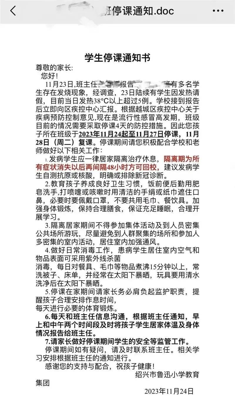 11月24日,浙江绍兴有一所小学通知一班级全班停课4天。
