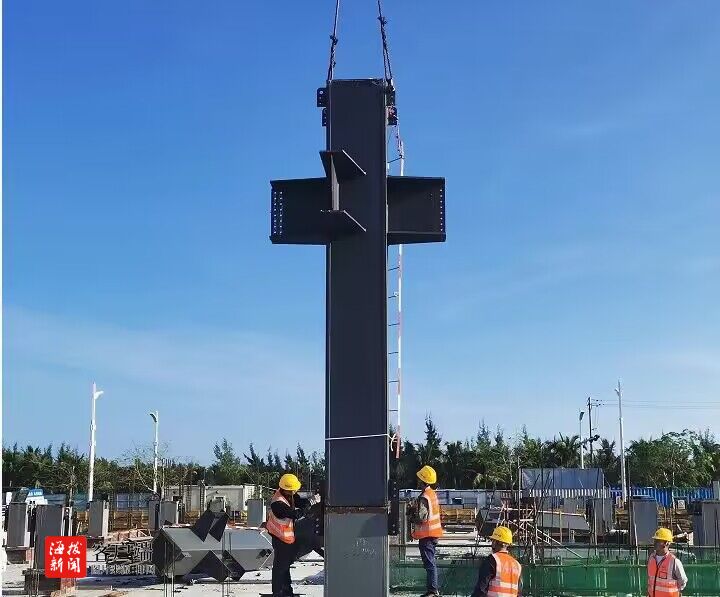 海口江东天地项目地上首节钢柱完成吊装最新进展→