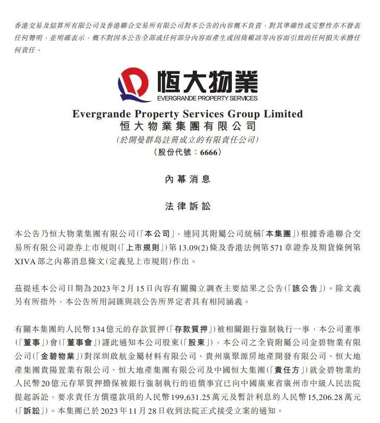 11月28日,恒大物业发布公告称,有关集团(恒大物业连同其附属公司)约134亿元的存款质押被相关银行强制执行一事,公司之全资附属公司金碧物业有限公司对深圳启航金属材料有限公司、贵州广聚源房地产开发有限公司、恒大地产集团贵阳置业有限公司、恒大地产集团有限公司及中国恒大集团(责任方)就金碧物业约20亿元存单质押担保被银行强制执行的追偿事宜已向广州市中级人民法院提起诉讼,要求责任方偿还款项约19.96亿元及暂计利息约1.52亿元。集团已于11月28日收到法院正式接受立案的通知。