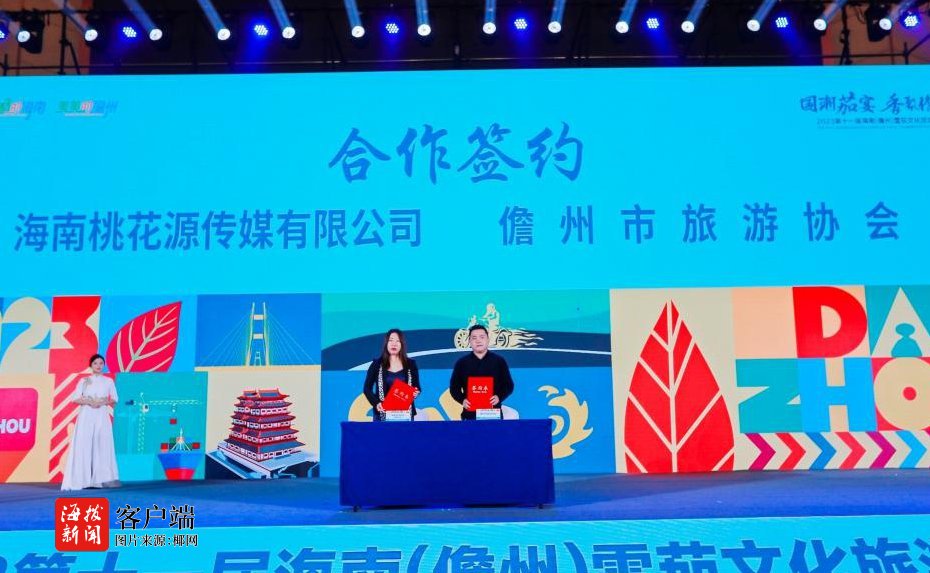 在开幕式上,海南桃花源传媒有限公司与儋州市旅游协会进行战略合作签约,双方将向广大游客宣传和推广儋州旅游品牌,将儋州的旅游资源打造成面向国内一流的旅游目的地,以最大限度发挥儋州旅游资源效能及促进旅游经济发展。