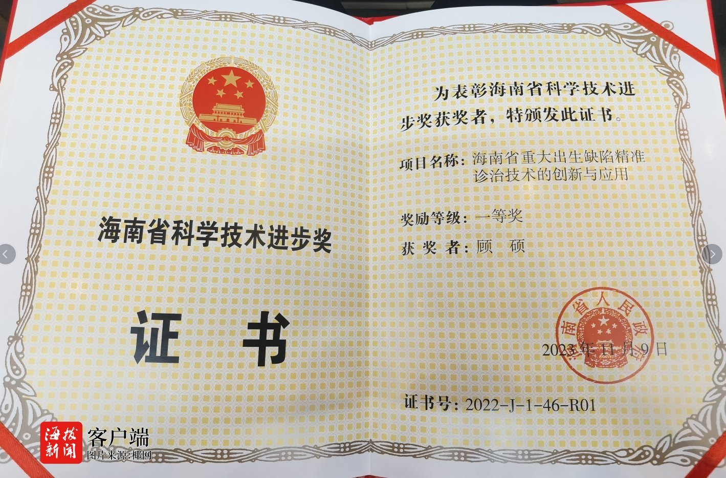 海南医学院第一附属医院党委书记、主任医师顾硕团队的研究项目“海南省重大出生缺陷精准诊治技术的创新与应用”荣获海南省科学技术进步奖一等奖。团队成员包括顾硕、刘锦纷、陆兆辉、凌奕、陈焕雄、陈建强、南瑞霞、张秋月、胡春霞、王海阳。