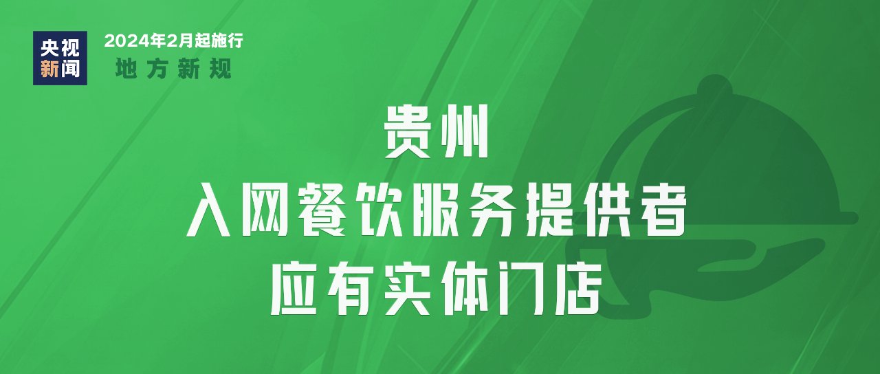 《贵州省食品安全条例》自2月1日起施行。条例规定,入网餐饮服务提供者应当具有实体经营门店并依法取得食品经营许可证或者小餐饮登记证。