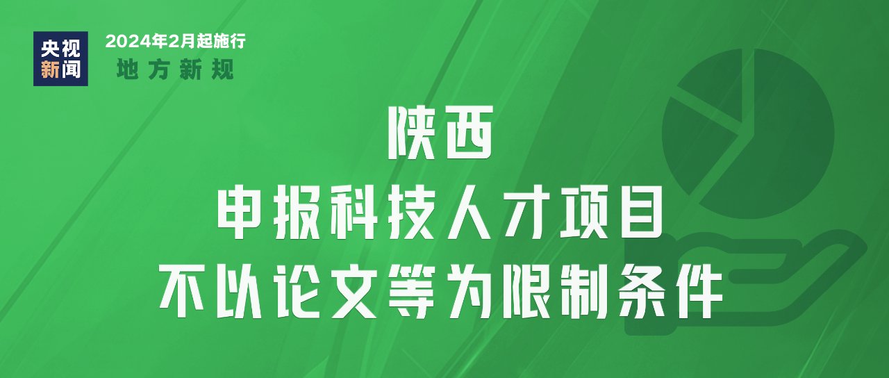 《陕西省科学技术进步条例》自2月1日起施行。条例明确,不以论文、职称、学历、奖励等作为申报科学技术人才项目的主要依据或者限制条件。