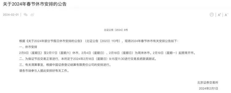 北交所同日公告,根据《关于2024年部分节假日休市安排的公告》(北证公告〔2023〕113号),现将2024年春节休市有关安排公告如下: