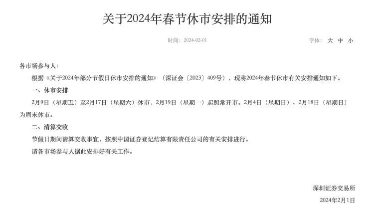 深交所同日公告,根据《关于2024年部分节假日休市安排的通知》(深证会〔2023〕409号),现将2024年春节休市有关安排通知如下。