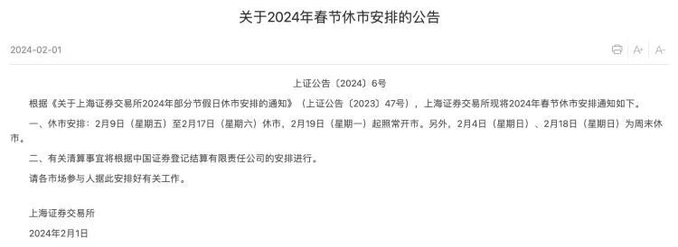 上交所公告,根据《关于上海证券交易所2024年部分节假日休市安排的通知》(上证公告〔2023〕47号),上海证券交易所现将2024年春节休市安排通知如下。