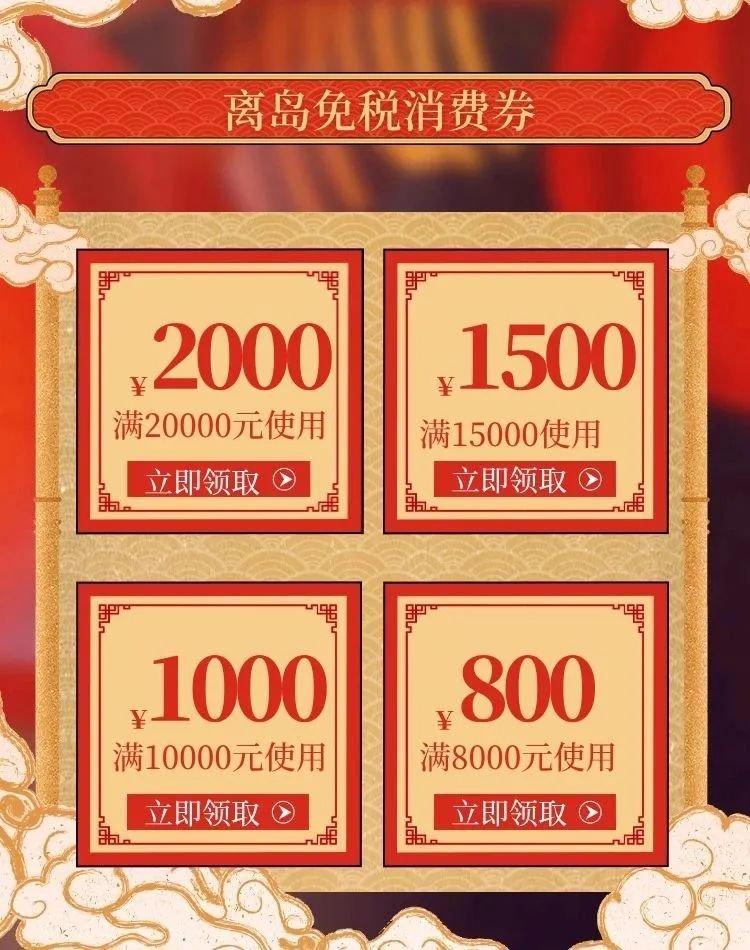 除免税消费券外,我们后续还将投放汽车消费券、家居家电数码消费券、超市零售消费券。好物不间断,精彩不打烊!