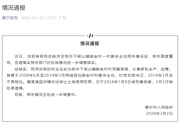 针对网传“广东普宁陂老村一村干部拥有60亩地,其中40亩地盖起了高楼、别墅和厂房”,3月2日下午,普宁市人民政府发布情况通报↓