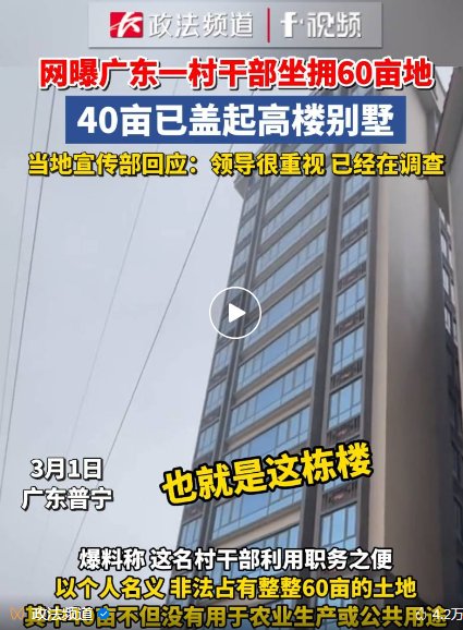 据媒体报道,近日,有律师曝光广东揭阳普宁一村主任侵占集体土地。报道称,普宁市陂老村村主任坐拥60亩地,光宅基地就接近7亩,家里修建得如同宫殿,还有40亩地被他盖起了高楼、别墅和厂房。