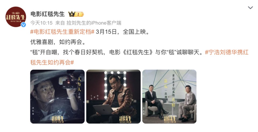 由宁浩执导、刘德华领衔主演的电影《红毯先生》在春节档激烈的竞争中无奈选择撤档。3月4日,影片发布“如约再会”版定档海报,宣布将于3月15日归来。