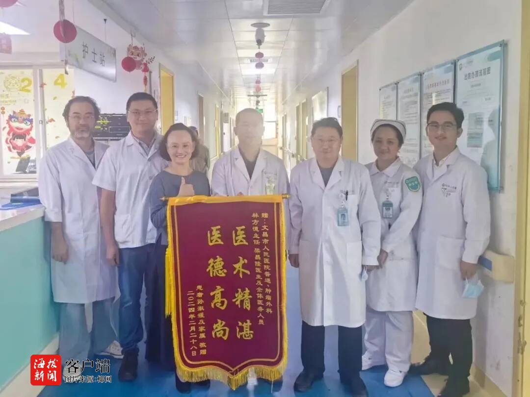 术后,孙婆婆恢复迅速,她特意嘱托家人送来锦旗,表达对医护人员的深深感激。孙婆婆的女儿在副院长林师佈的陪同下,将锦旗送到普外、肿瘤外科的医生手中,并合影留念,对主治医师精湛技术与真诚服务给予了高度赞扬与肯定。