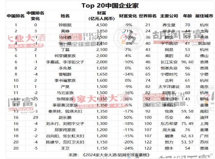 《2024胡润全球富豪榜》发布,Top20中国企业家都有谁?