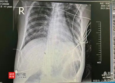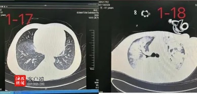1月18日,41岁的退役军人丰大哥突发胸闷、气促,血氧低至75%,由肝胆外科转入海南医学院第一附属医院重症医学科。丰大哥转入重症医学科后,为了进一步明确诊断,管床医师、规培医师及护理老师冒着在路上抢救的风险紧急将丰大哥送往CT室进行胸部CTA检查。CT结果显示丰大哥未见肺栓塞征象,但两肺大片炎性渗出,80%~90%的肺功能已经丧失,也就是俗称的“大白肺”。