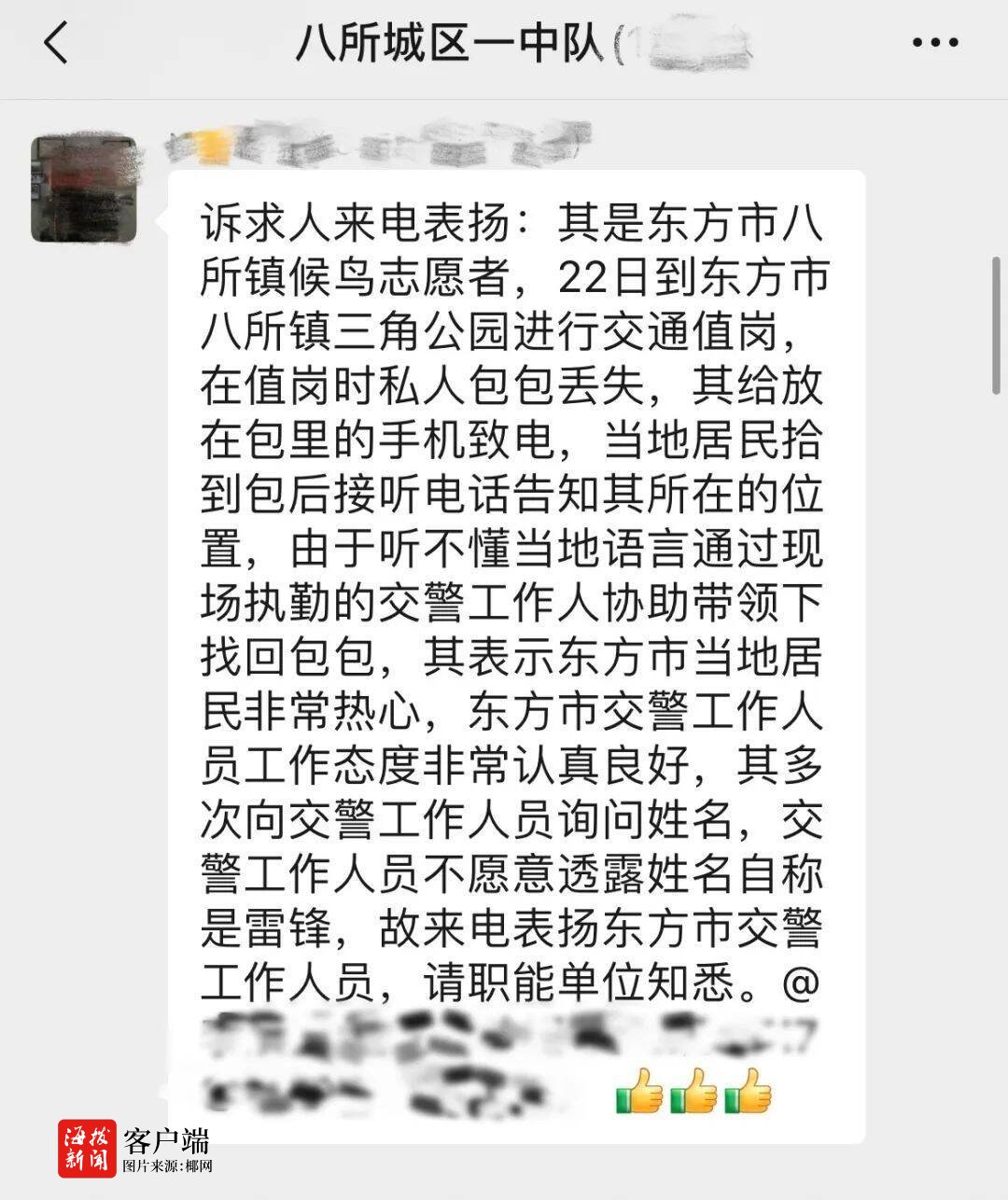 收到赵女士的感谢信后,东方市公安局领导高度重视,要求交警大队立即核实情况,并通报表扬该名执勤交警,同时请全体民辅警以该同志为工作榜样,在日常的工作中全心全意为人民服务,切实将“我为群众办实事”走深走实。经核实,该名执勤交警是三角公园岗的执勤队员韩雪平。(吴平)
