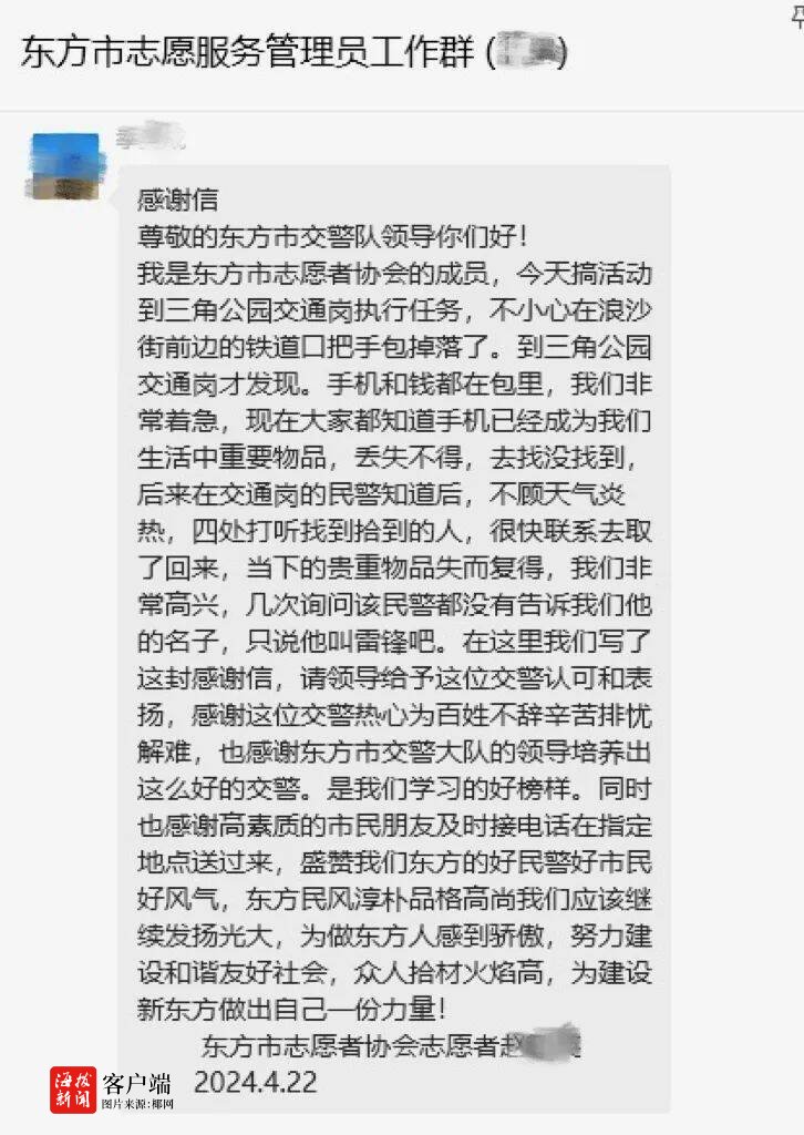 商报全媒体讯 4月22日,海南“12345”热线、“东方市志愿服务管理员工作群”同时收到来自市民赵女士的一封“感谢信”,该信讲述了一件令其十分感动的事。而这一封信,从一件小事反映出东方公安为民服务的温度。