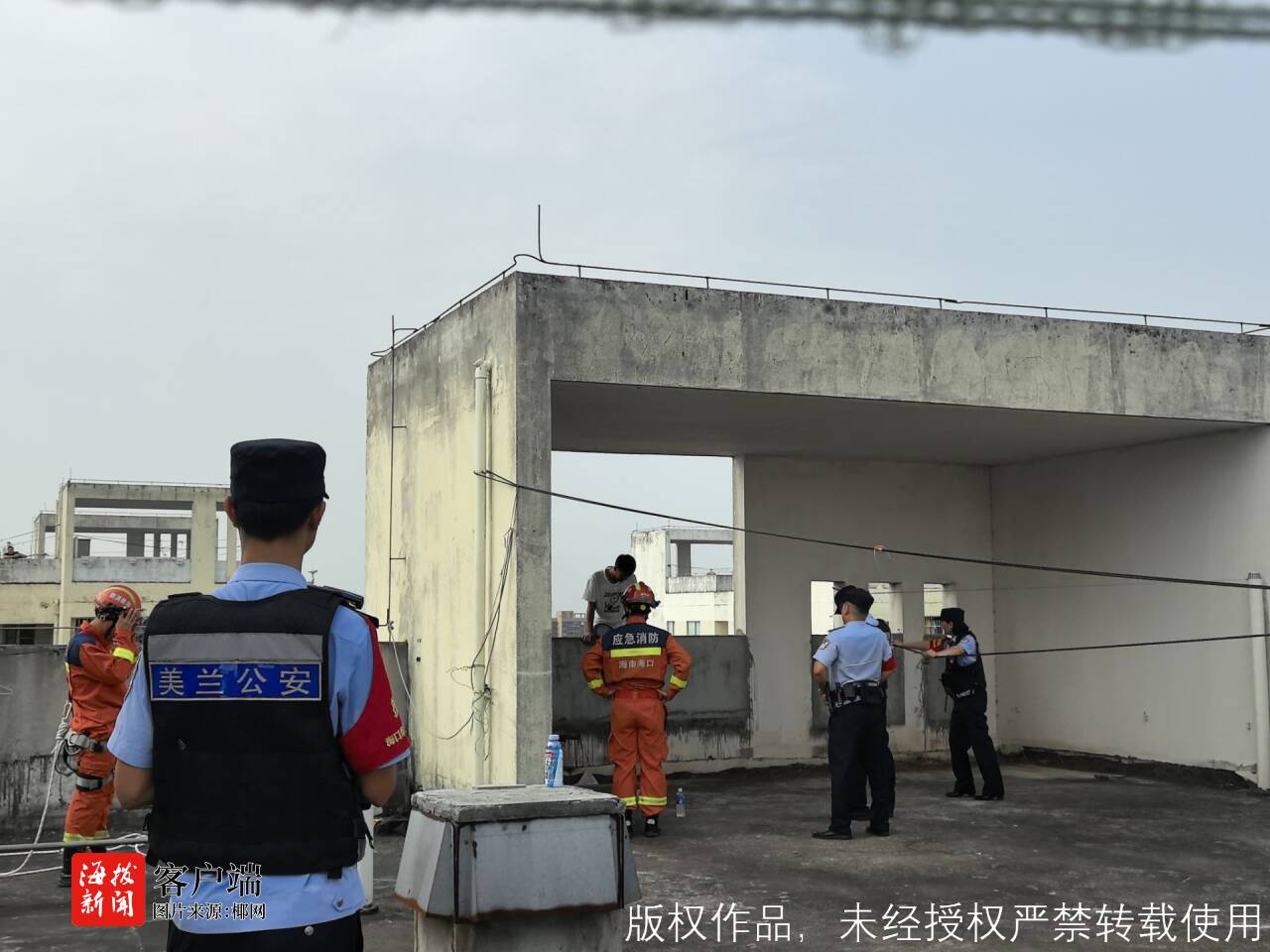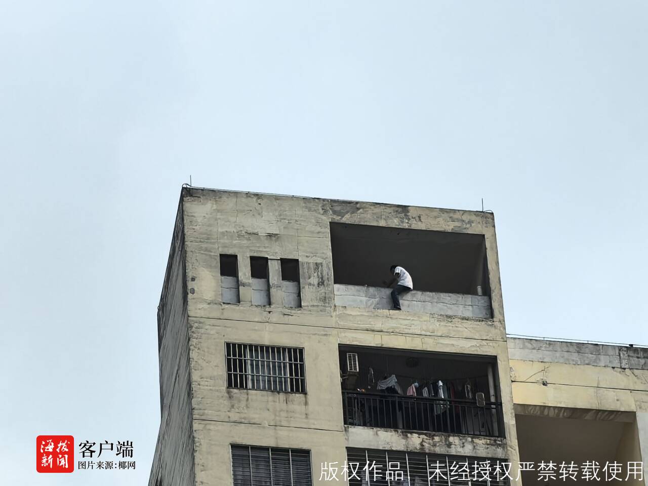 记者乘坐电梯上到小区C栋27层,通过楼梯到达该楼平台处,此时海口美兰公安民警和消防救援人员正与男子展开对话,安抚其情绪,试图寻找机会将男子救下。