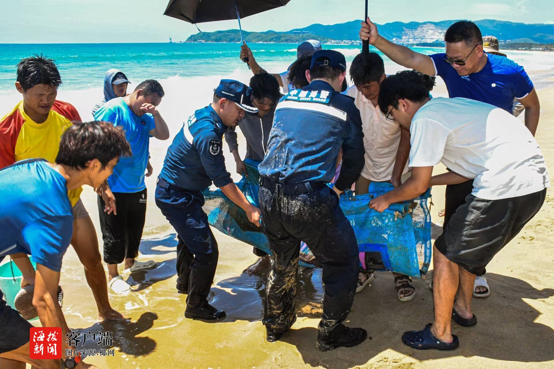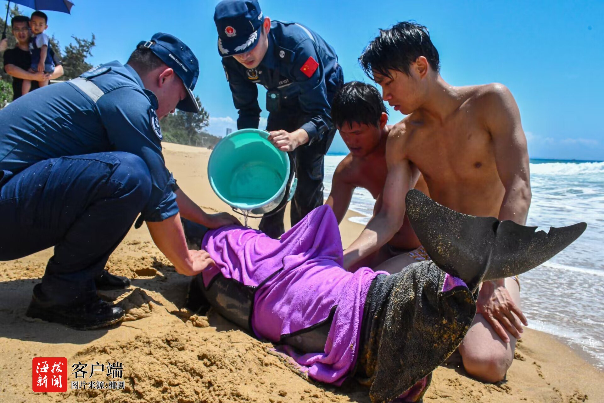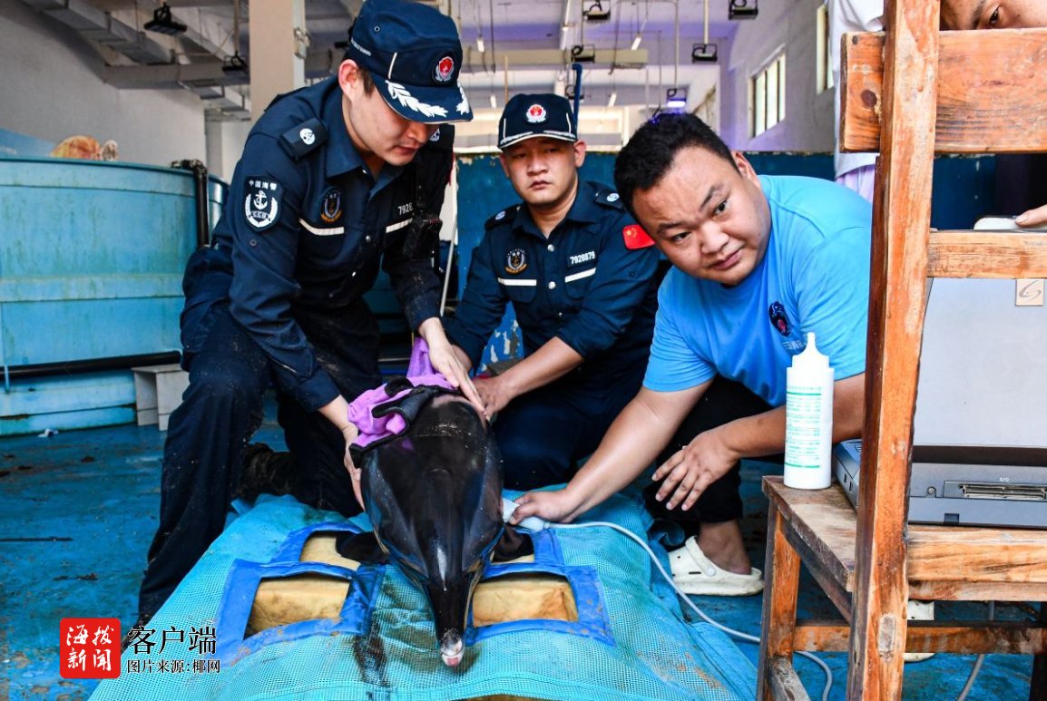执法员到达现场后看到搁浅的是一条体长不足两米的幼年海豚,被困在浅水区,嘴部有明显的伤痕,无法自行游动。在现场专业人士的指导下,执法员合力将海豚转移到沙滩上,并用打湿的毛巾包裹海豚表面,向海豚浇水降温。在确保海豚状态基本稳定后,执法员与专业人员一同将海豚运送到三亚海昌梦幻海洋不夜城保育中心进一步观察与救治。截至记者发稿时,海豚仍处于危险期,由专业医护团队持续观察处理。