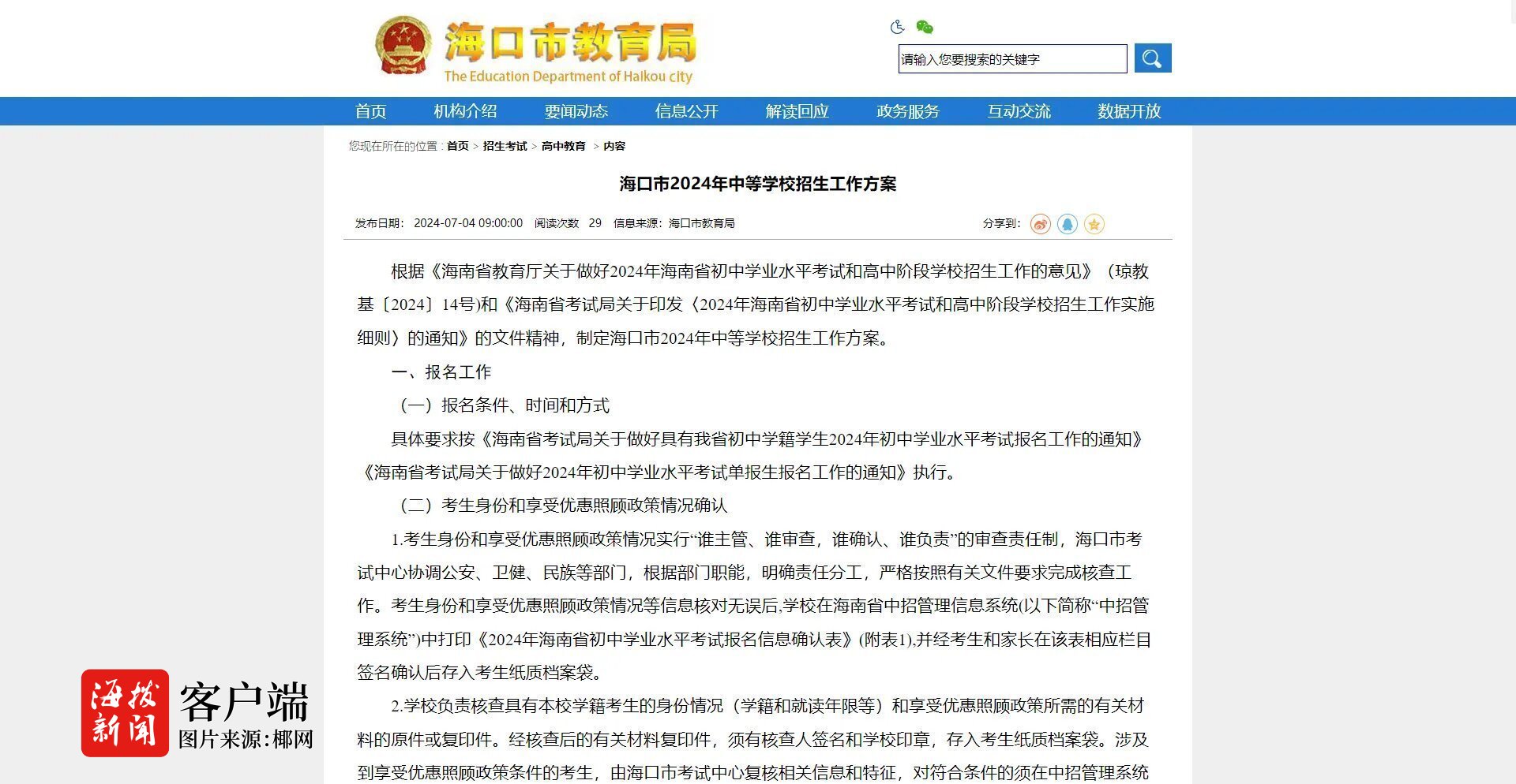 商报全媒体讯(椰网/海拔新闻记者 许文玉)7月4日,海口市教育局发布海口市2024年中等学校招生工作方案。今年海口市中招工作有哪些要求?工作时间如何安排?填报志愿有何注意事项?一起来看。