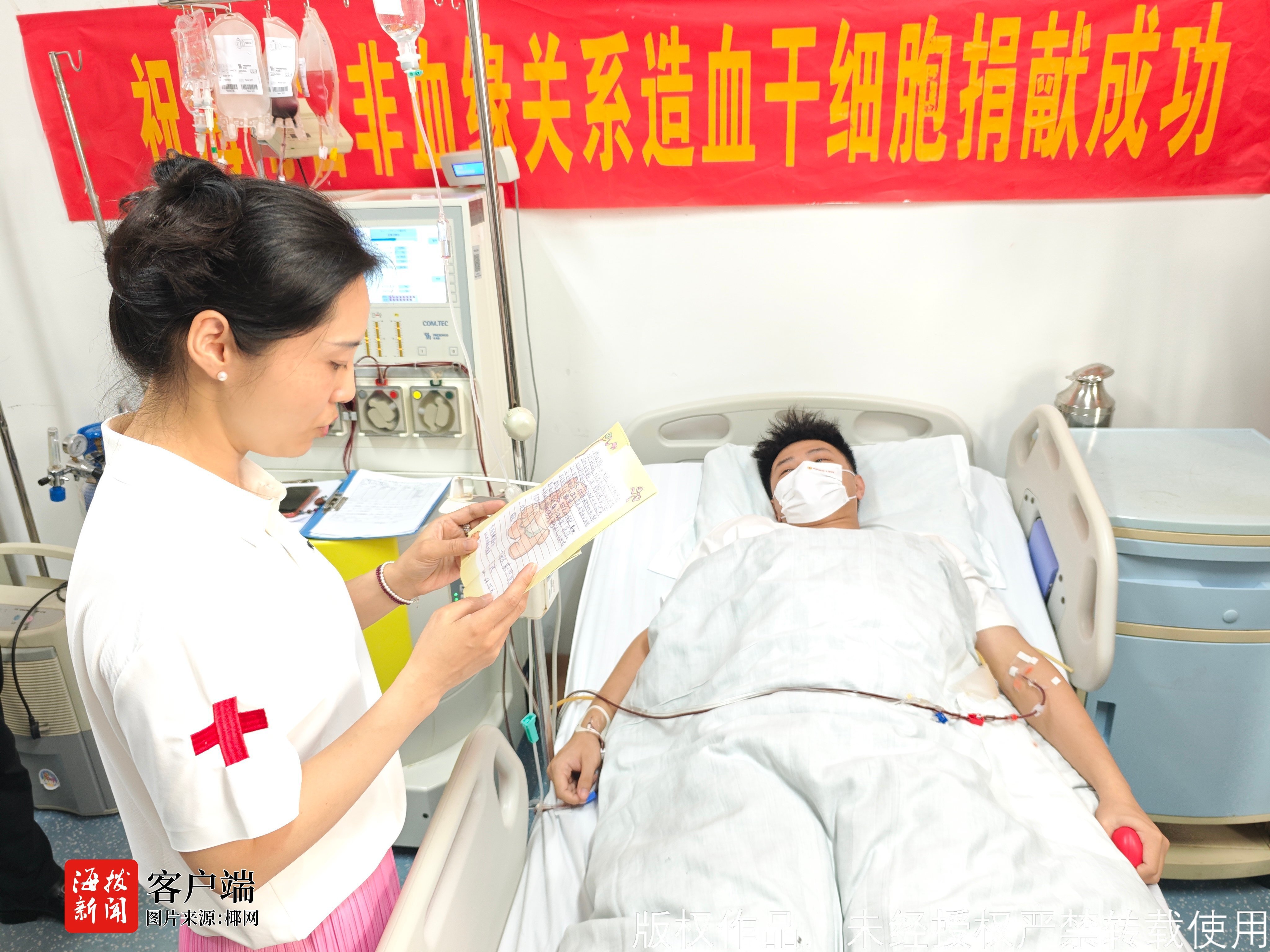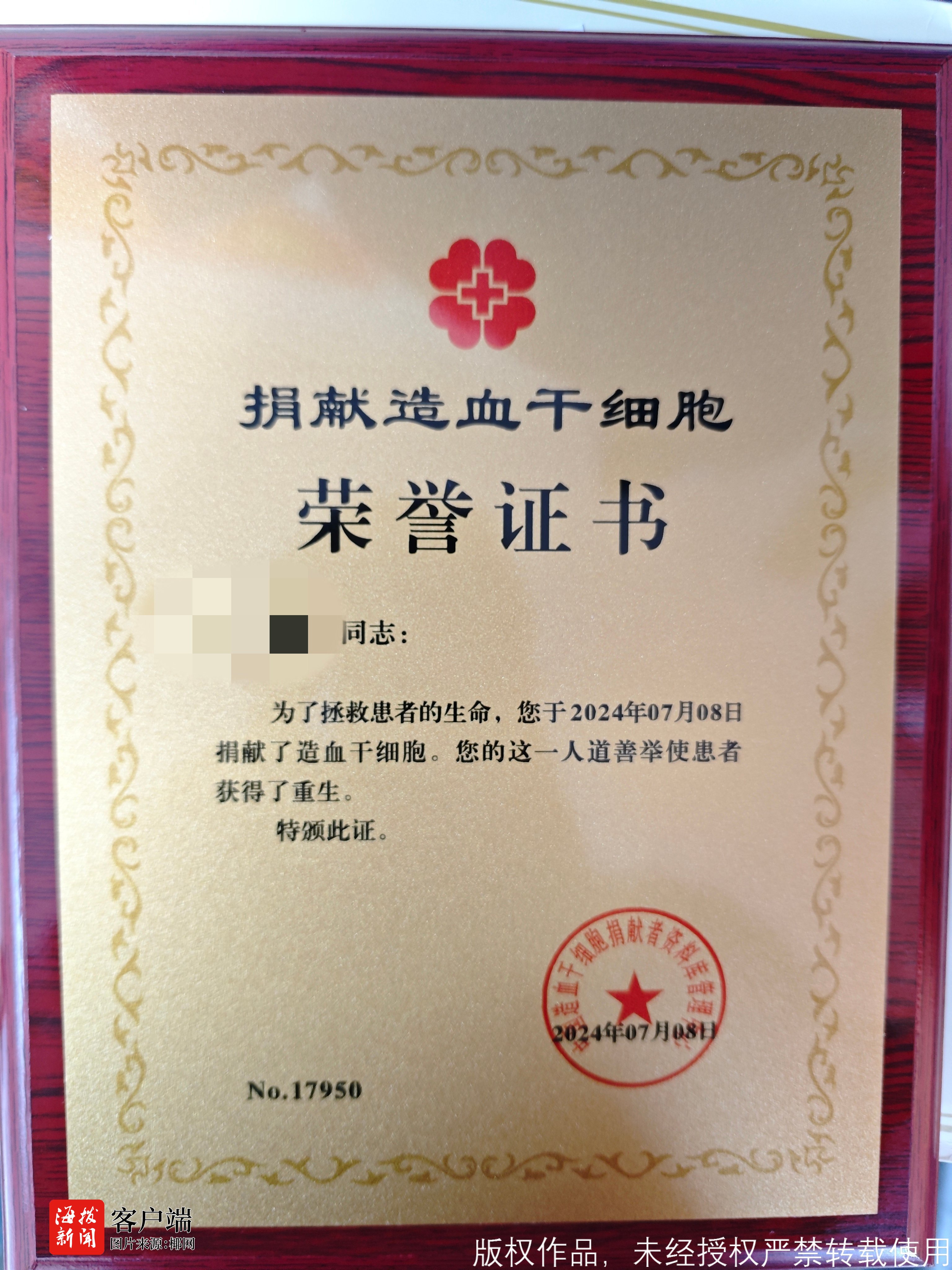 商报全媒体讯(椰网/海拔新闻记者 孙鑫 摄影报道)7月8日,海南省第200例造血干细胞捐献者阿伟(化名)在海口市人民医院顺利完成捐献采集,为远方一名陌生的血液病患者送出一份无比珍贵的“礼物”。海南省红十字会党组成员、副会长周国明,三亚市红十字会党组书记、常务副会长张华菊,海南省红十字医学捐献服务中心副主任何庆光,海口市人民医院副院长张剑权,以及阿伟所在单位领导到场见证、慰问,并为阿伟颁发捐献荣誉证书,代表受捐家庭对其大爱行为表示敬意和感谢。