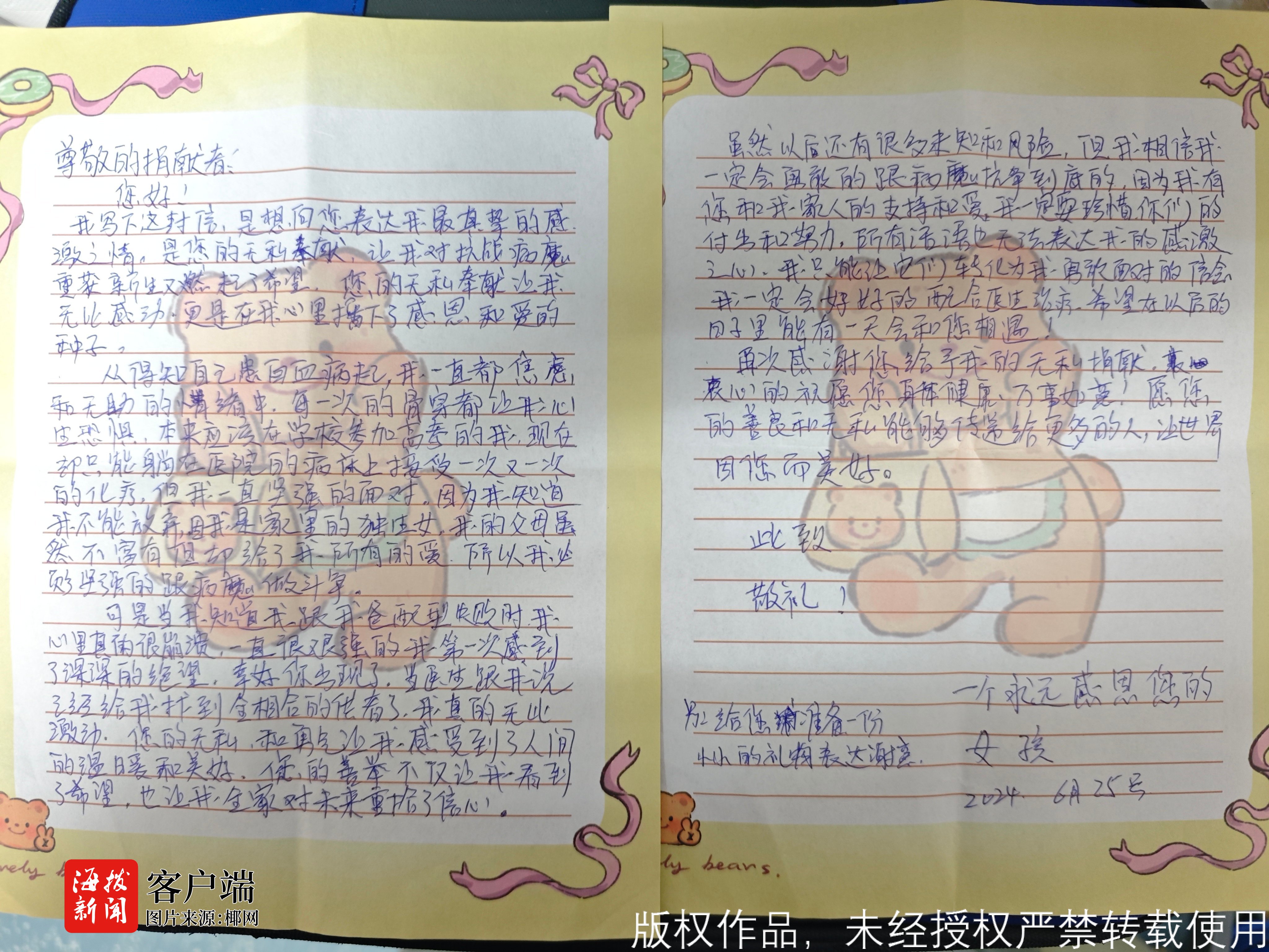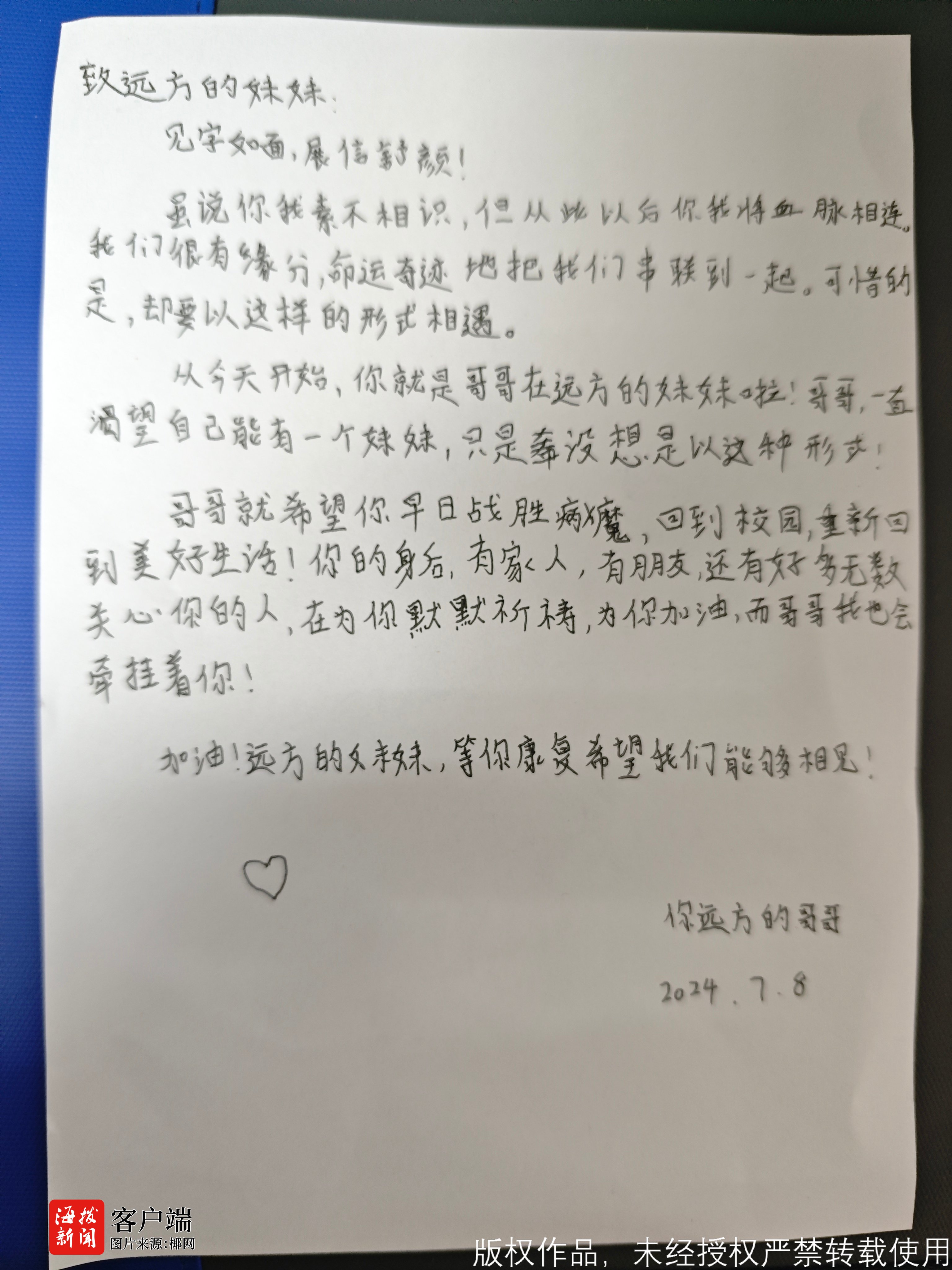 据介绍,阿伟来自琼海,目前在三亚从事酒店管理工作。同时,他也是家中的独子,此次捐献造血干细胞这件事,并没有告知家人,直到到达医院为捐献工作做准备时,阿伟才告知了家人。阿伟表示,此刻他还想对那位与病魔抗争的患者说:“希望你早日康复,开启绚烂多彩的人生。在自己力所能及的范围内帮助其他需要帮助的人,让爱传递下去。”