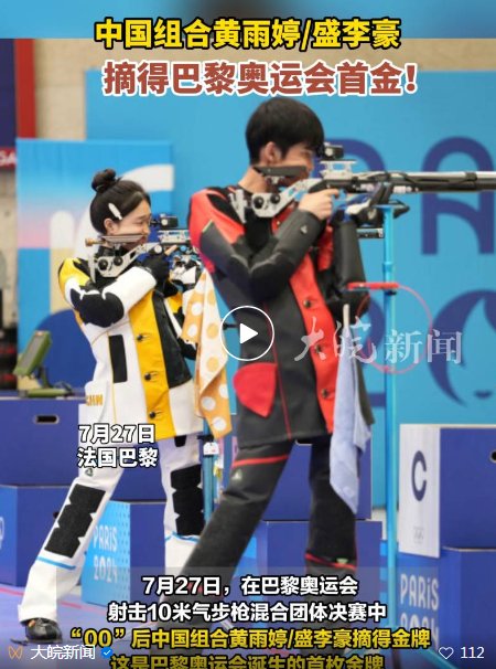 北京时间7月27日,在巴黎奥运会射击混合团体10米气步枪金牌赛中,中国组合黄雨婷/盛李豪夺得冠军!这是本届奥运会中国代表团的首枚金牌。