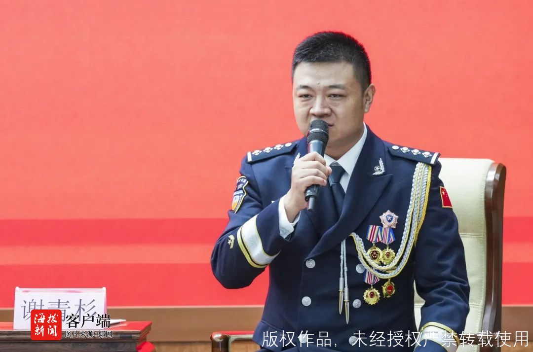 商报全媒体讯(椰网/海拔新闻记者 孙鑫 张艺 摄影报道)8月6日,“公安心向党 护航自贸港”海南省公安系统模范集体和模范人民警察代表记者见面会(第一场)在海口举行。会上,“海南省模范人民警察”代表,东方市公安局交通警察大队大队长、警务技术四级主管谢青杉进行发言并回答记者相关问题。