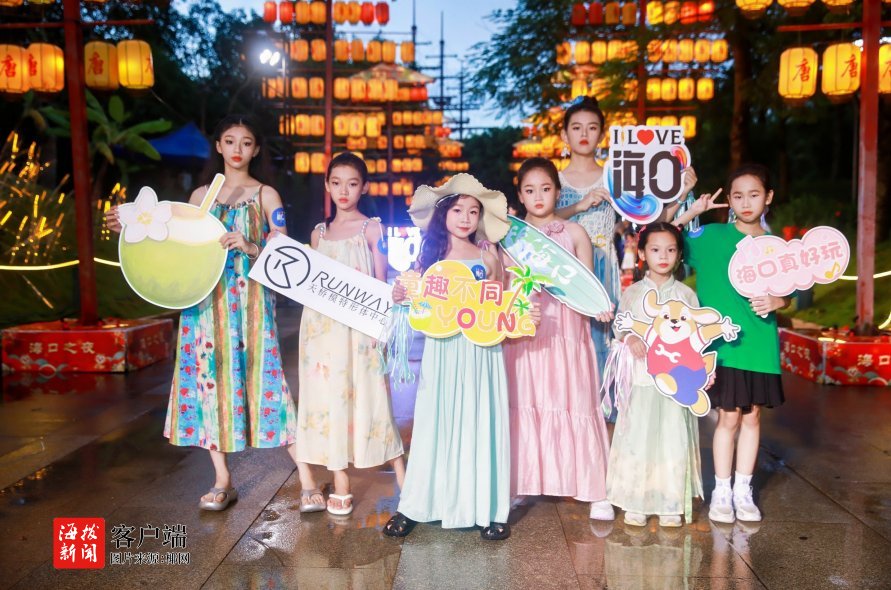 活动现场,踏着音乐而来的是欢快的少儿走秀,萌娃们穿着充满海岛气息的多彩服装,拿着椰子、冲浪板等小道具在星光与灯光的交织下,尽情展现海口独有的假日风情;梦回千年大唐、《“鼓”动奇迹》震撼登场;动感十足的少儿架子鼓表演,每一个音符都敲打着心跳,跟着节奏一起摇摆感受那份属于童年的无限活力;穿着古装的小模特,互动打卡,欢乐不停歇。其中,在“Hi!遇见海口”打卡区,大家手持创意满满的拍照板,在灯火阑珊处与这梦幻时空来一场亲密合影,让这美好瞬间定格为永恒,留住每一张笑脸。