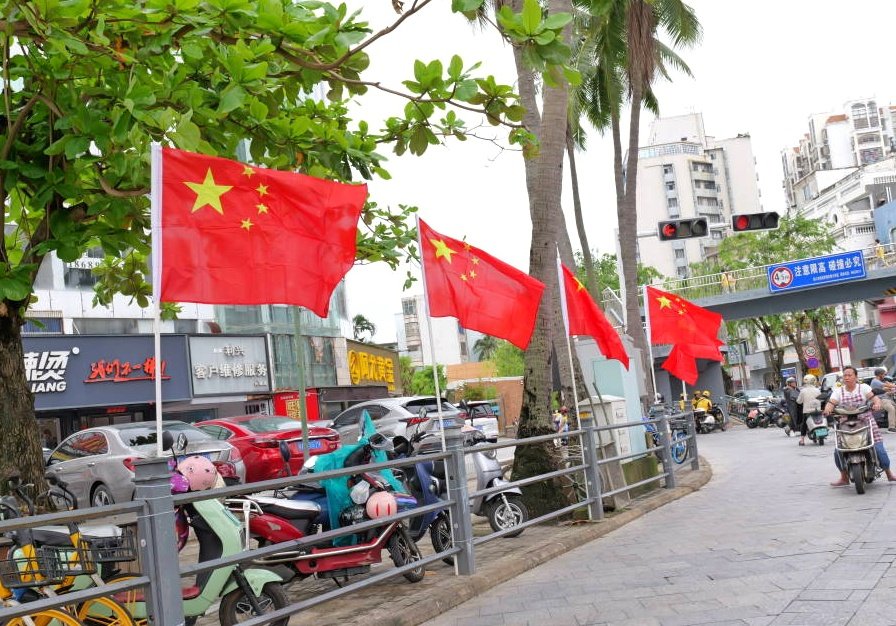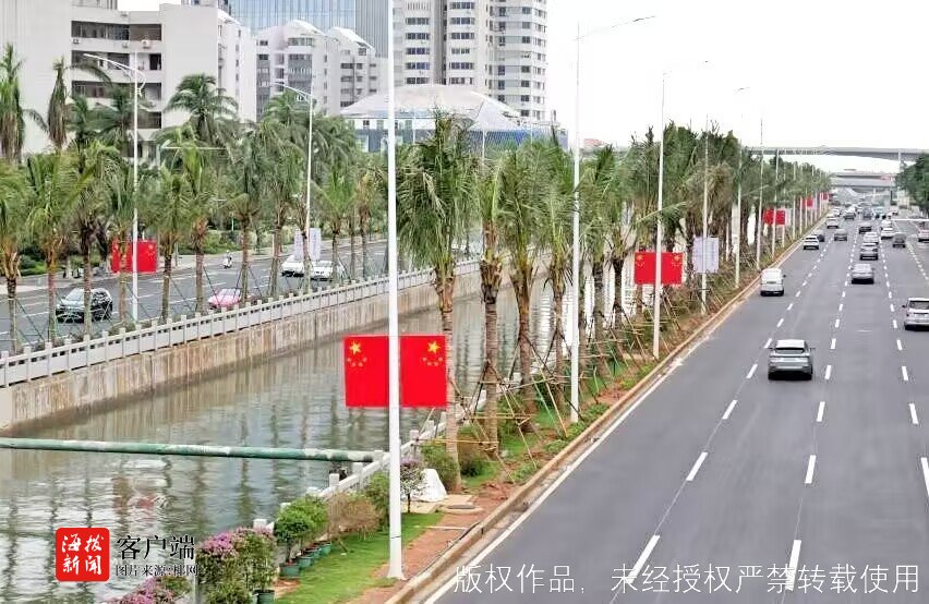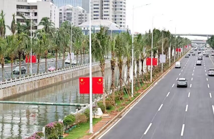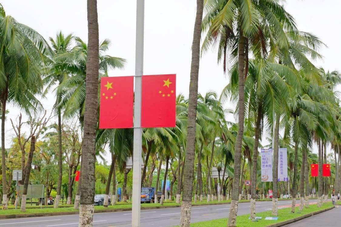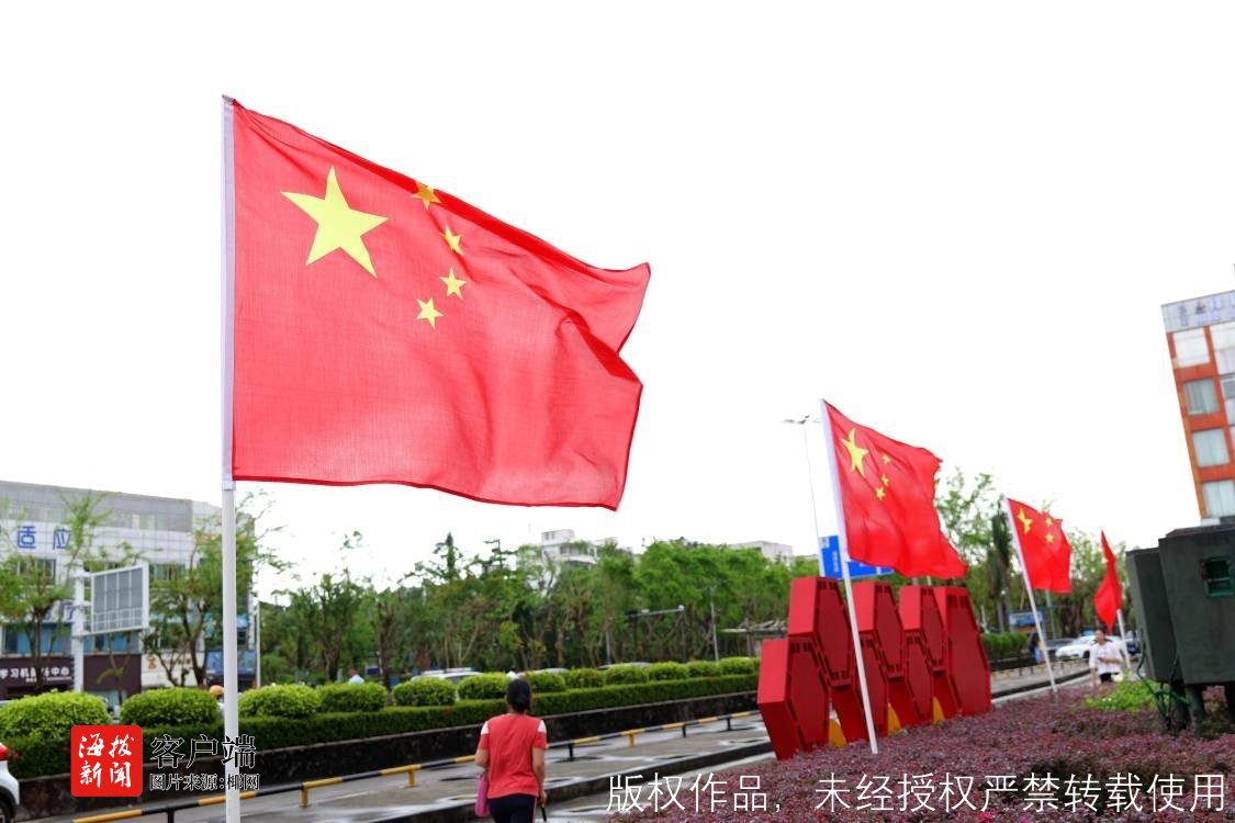 喜迎国庆氛围浓 海口街头飘起“中国红”