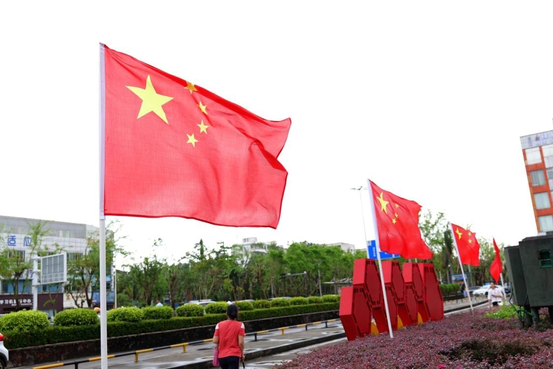 在解放路、龙昆北路、滨海大道、世纪大桥等地,放眼望去一片“中国红”。一面面鲜艳的五星红旗迎风招展,在阳光的照耀下鲜艳的红色与蓝天白云交相辉映,构成了一幅美丽的画卷。行人经过时情不自禁地抬头仰望,有的还拍照留念。