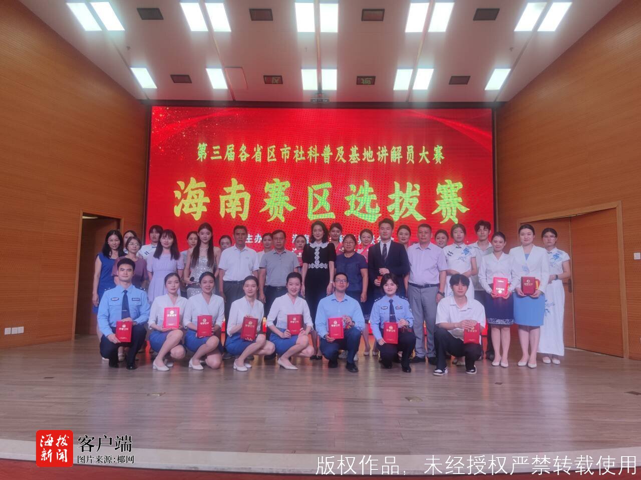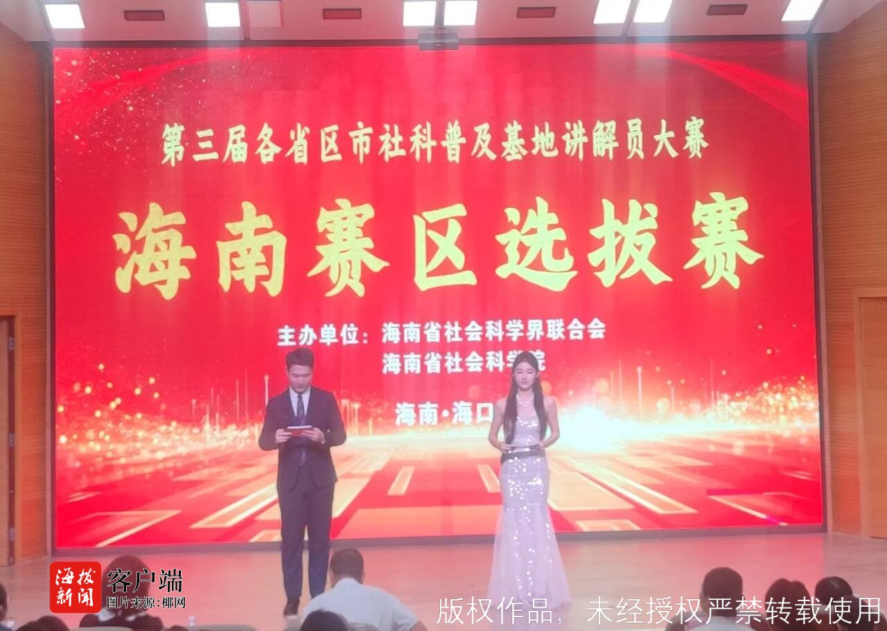 第三届各省区市社科普及基地讲解员大赛海南赛区选拔赛由海南省社科联(社科院)主办,海南省图书馆、国际旅游岛商报社协办。来自海南大学、海南师范大学、海南医科大学、琼台师范学院、海口经济学院等院校师生代表以及三亚社科联、全省各社科普及示范基地代表参加观摩选拔赛。选拔赛的成功举办,不仅为海南省的社科普及工作注入新的活力,也为全国社科普及事业的发展贡献海南力量。