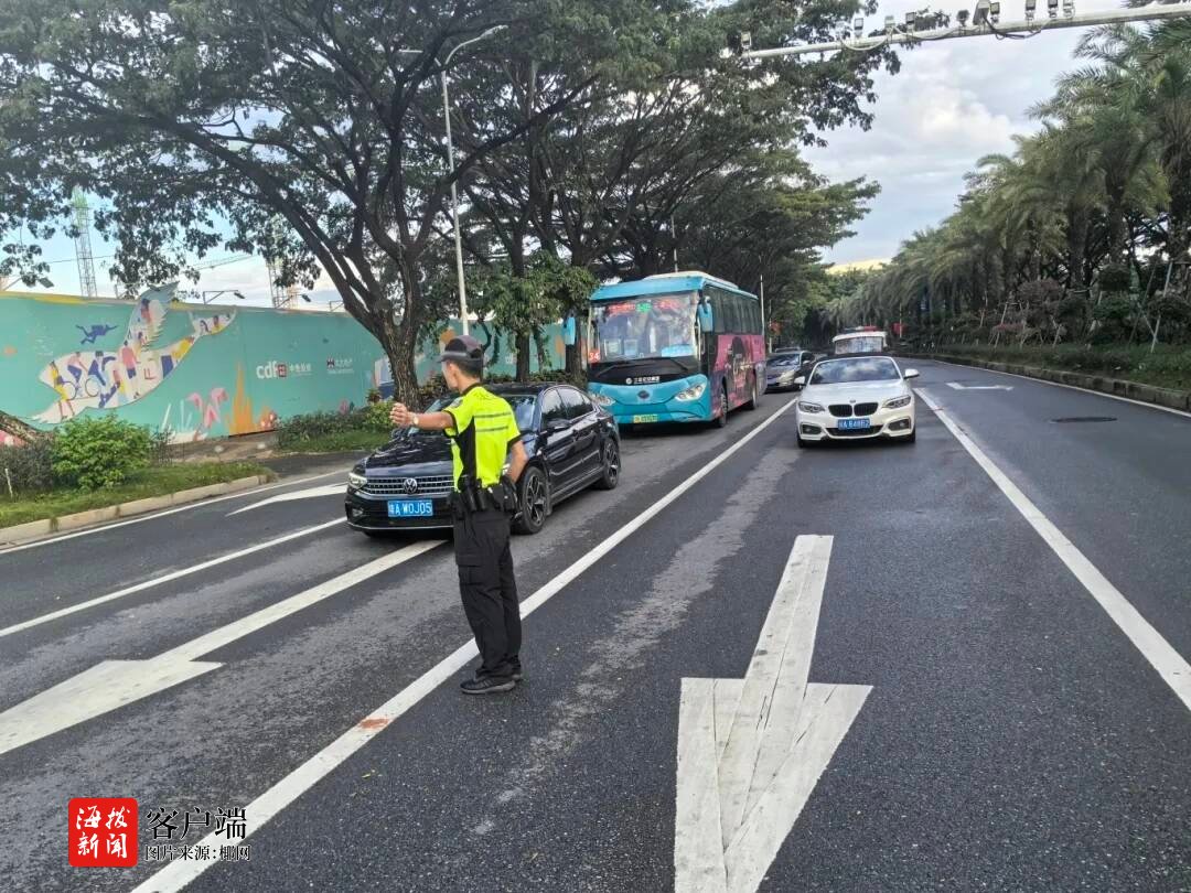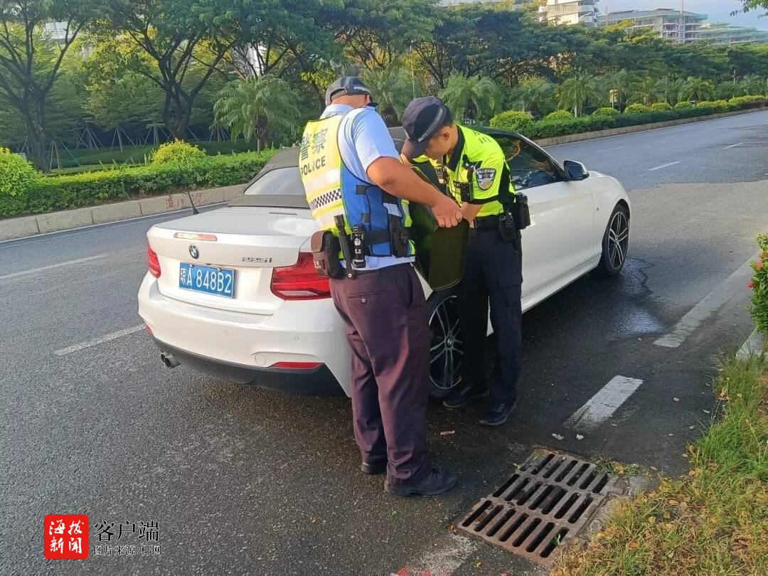 据了解,10月6日,三亚交警海棠大队执勤交警在海棠区龙海路开展巡逻勤务,当巡逻至龙海红绿灯路口时,发现一辆白色小型轿车打着警示灯停滞在路中间,导致整条路段车流缓慢通行。