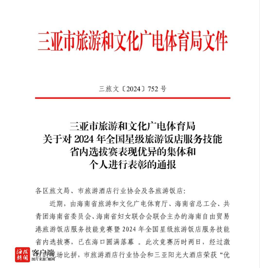 商报全媒体讯(椰网/海拔新闻记者 熊文颖)为表彰在海南自由贸易港旅游饭店服务技能竞赛暨2024年全国星级旅游饭店服务技能省内选拔赛工作中作出突出贡献的集体与个人,弘扬工匠精神,激励三亚市旅游饭店从业人员提升技能、优化服务,10月16日,《三亚市旅游和文化广电体育局关于对2024 年全国星级旅游饭店服务技能省内选拔赛表现优异的集体和个人进行表彰的通报》(以下简称《通报》)印发,授予8个集体“表现突出集体”荣誉称号,11人“表现突出个人”荣誉称号。