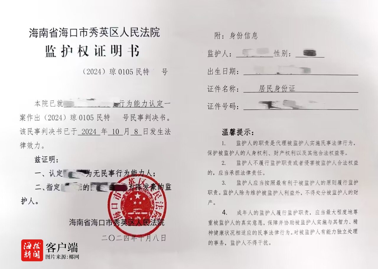 商报全媒体讯(椰网/海拔新闻记者 柯育超 通讯员 田诗默)为进一步提升司法便民利民深度和力度,近日,海口市秀英区人民法院在依法判决一起认定公民限制民事行为能力、指定监护人案件后,向案件当事人发出全省首份《监护权证明书》。