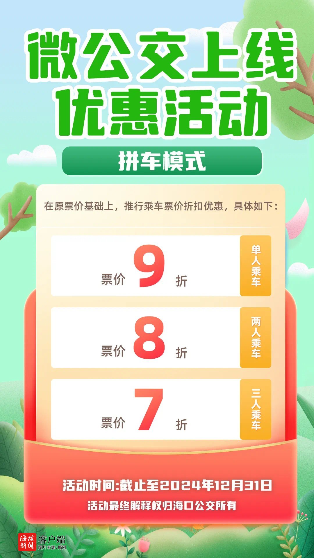微公交鼓励市民绿色、集约化出行,现在起至2024年12月31日,在原票价的基础上,推行乘车票价折扣优惠,具体如下: