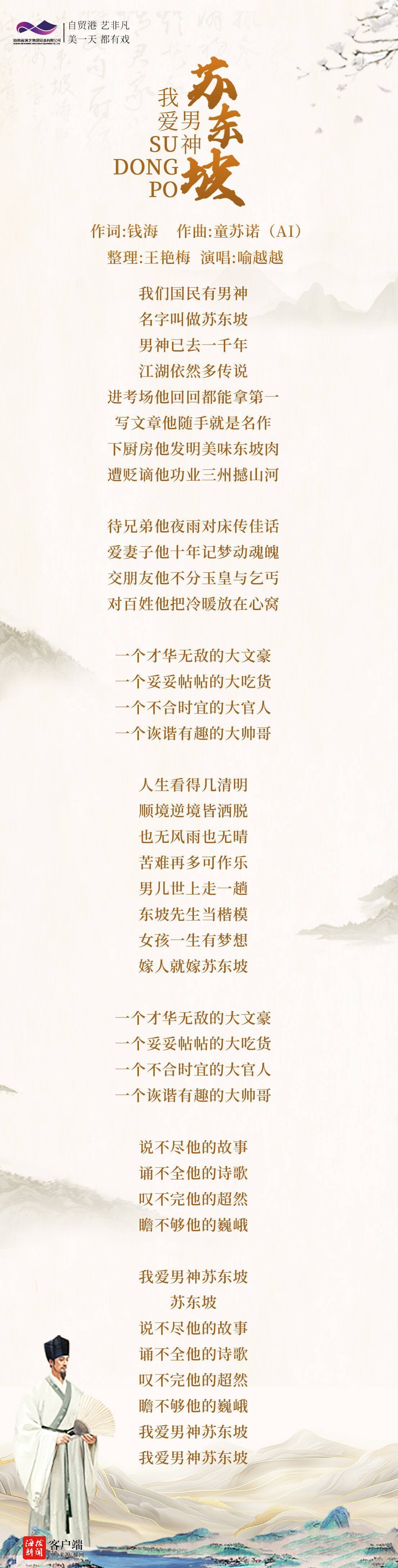 商报全媒体讯(椰网/海拔新闻记者 张艺 陈王凤)11月8日,备受瞩目的全国首个宋韵书院沉浸式文旅演出《男神东坡》主题曲——《我爱男神苏东坡》全网震撼上线。歌曲创新运用AI作曲,歌词风趣幽默,通过青年歌唱家喻越越的深情演绎,带领听众穿越时空,领略男神东坡的独特魅力。