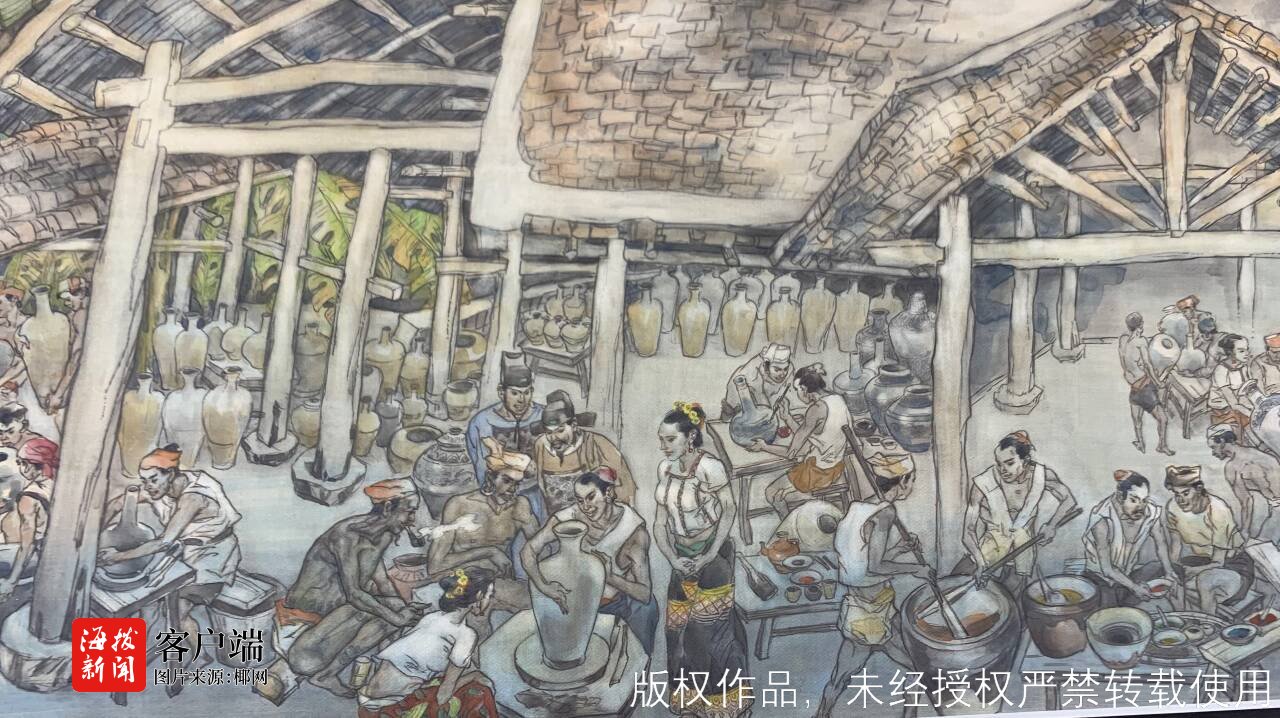在谈到创作过程中的具体细节时,钟开天显得格外激动。他感慨地说:“整个创作过程工程巨大,旷日持久,13年来极大地考验着我的耐力和意志力。”他举例说,为了真实还原历史场景,他付出了巨大的努力。例如,在描绘郑和船队抵达锡兰国(今斯里兰卡)的场景时,他专门研究了当地的明代石碑,并在画中细致描绘了这块石碑的每一个细节。这样的例子不胜枚举,正是这些细致入微的工作,使得这幅长卷在历史准确性上达到了极高的水平。