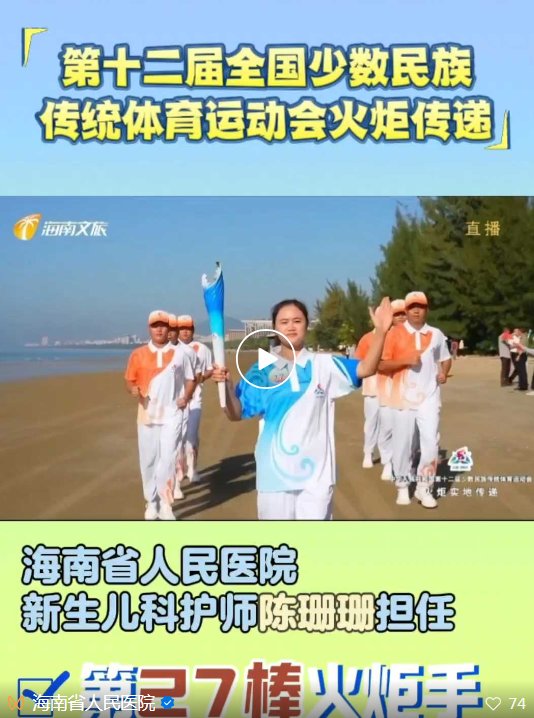 值得一提的是海南省人民医院新生儿科护师陈珊珊也成为第十二届全国少数民族传统体育运动会火炬手中的一员,她高高擎起象征着希望与团结的火炬,与其他106位来自各行业的火炬手通过“海陆空”接力方式完成火炬传递。