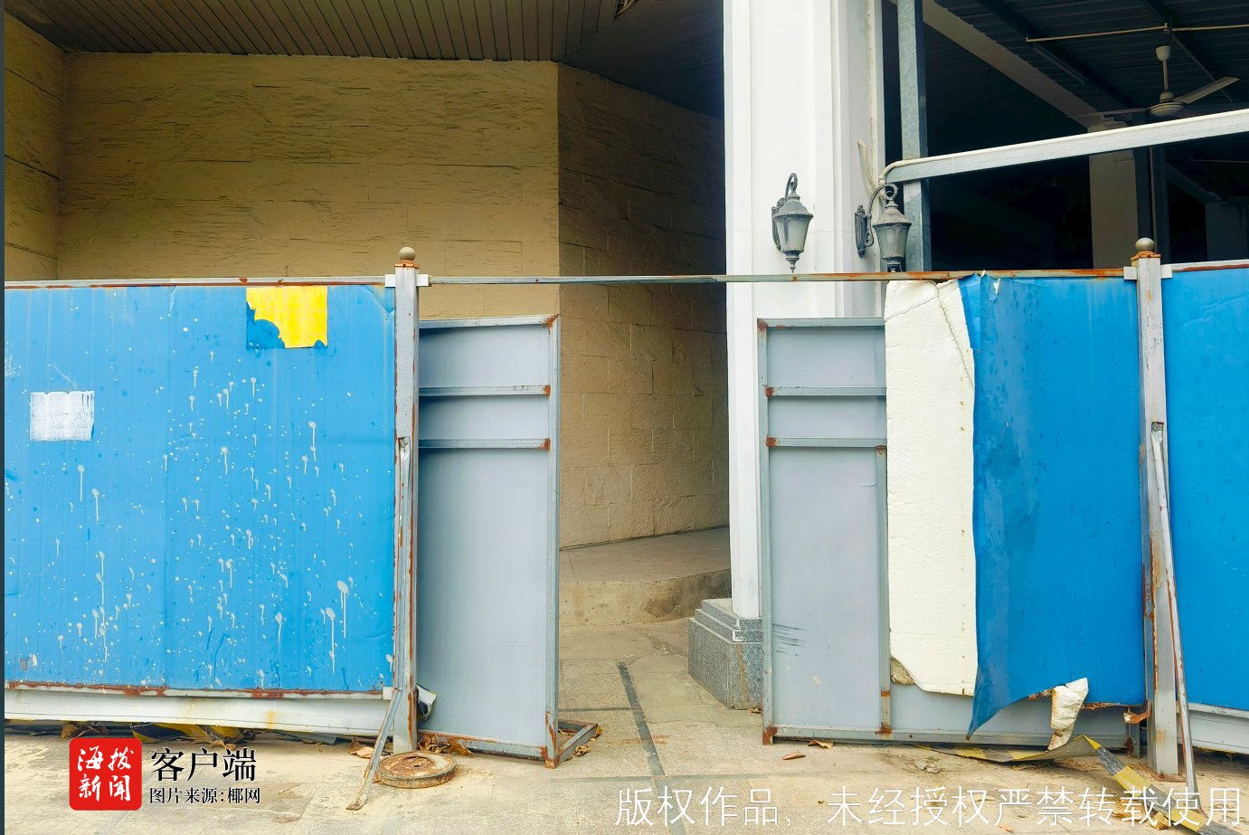 今年1月15日,有网友在平台上发布视频称:“市中心的东方大酒店,不知何故,已经围起来,荒凉了很久。”次日,记者前往三亚东方海景大酒店一探究竟,只见酒店周边已经搭起了蓝色的围挡,门前的空地停满了大小不一、颜色各异的小轿车。通往建筑内部的大门也被蓝色的围挡隔断,无法走进建筑内部,抬头可以看到破损的墙壁、掉落的天花板、缺失的窗户……最显眼的“东方海景大酒店”名称也不复存在,只在墙上留下一些斑驳的印记。