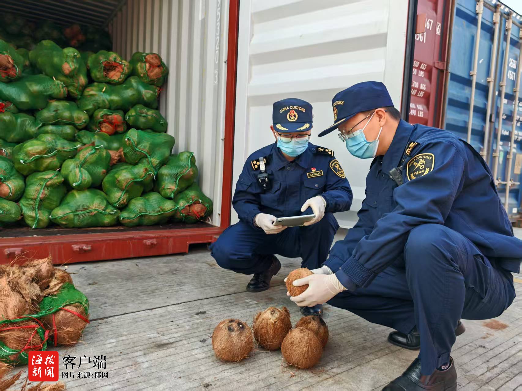 洋浦海关关员陈业坚正在开展对进口椰子进行查验(左一)